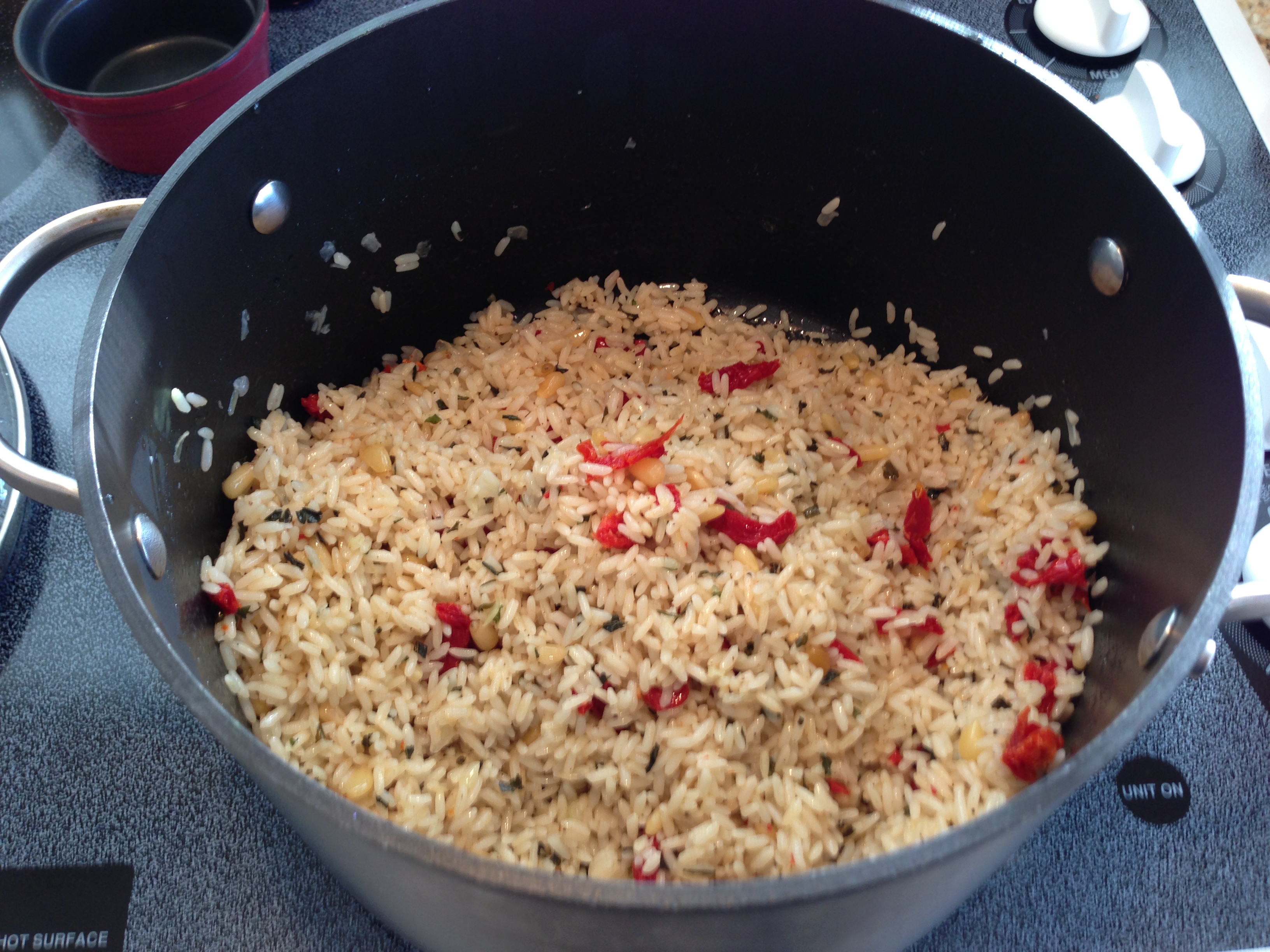 Place olive oil in large pot (with lid). Heat oil on med.-heat. Add onion and saute until translucent, about 5 minutes. Add rice and stir 1 minute Add broth and bring to boil. Reduce heat to low. Cover and cook until broth is absorbed, about 20 minutes. Still in basil, sun-dried tomatoes and toasted pine nuts. Add 1 T butter and season with salt and pepper to taste. Serve hot.