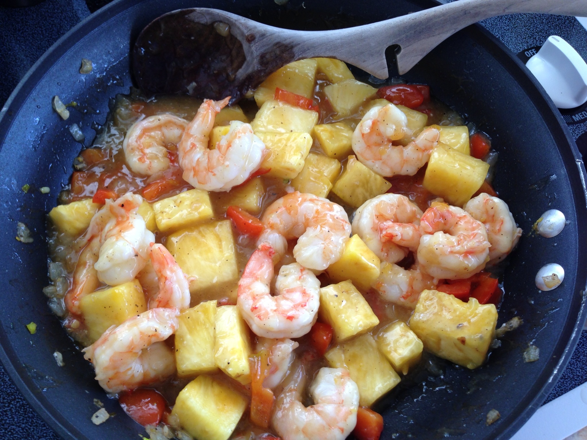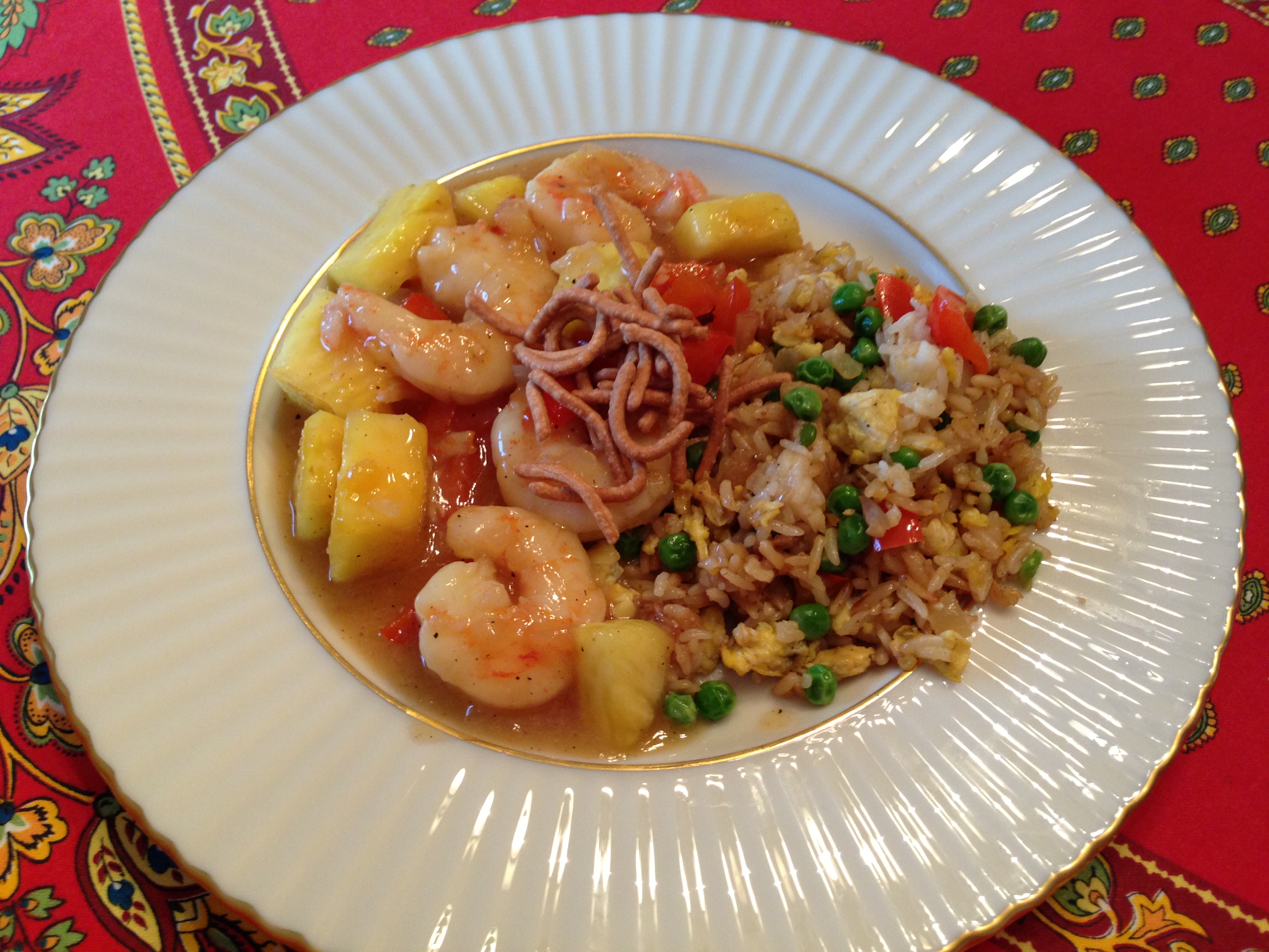 Clean and devein shrimp, rinse well and set aside to drain. Place 2 T olive oil in large fry pan or wok. Heat to medium-high heat. Add onion and bell pepper to the fry pan and saute for about 3 minutes or until the large chunks of pepper soften. Add shrimp, sprinkle with salt and pepper. Add juice of 1/2 lemon and the zest. Add 1/4 tsp. of zest from the peeled ginger. Fry the shrimp, for about 3 minutes, make sure to stir and turn the shrimp. Add the jar of Duck Sauce, stir. Add the container of fresh chunk pineapple, stir. Add splash of soy sauce, and more salt and pepper to taste. Saute for 2 minutes, blending well. Serve along with fried rice and top with chow mien noodles. IMPORTANT: MUST SERVE THIS IMMEDIATELY, PINEAPPLE IS AN ACID AND WILL MAKE SHRIMP (OR CHICKEN) MUSHY IF LEFT TOGETHER TOO LONG!