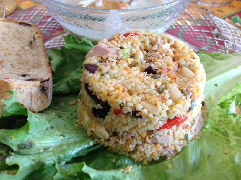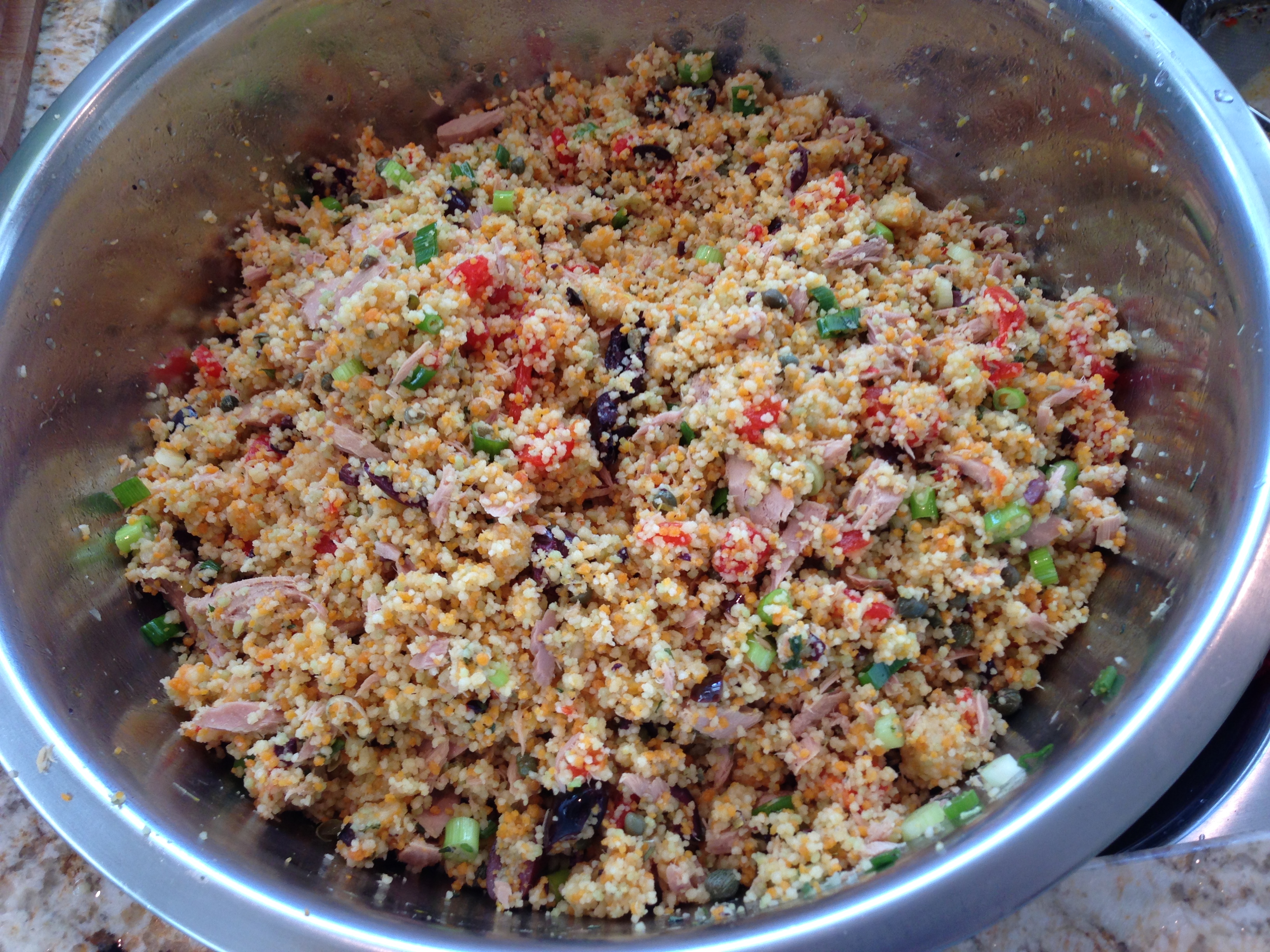 Combine the tuna, lemon zest, lemon juice, olive oil, capers, olives, red peppers, garlic, salt and pepper in large bowl.   Toss gently, do not brake up the tuna too much.  Add the couscous into the mixture and blend.  Cover and set aside for 10 minutes, stirring occasionally.  Toast the pine nuts for two minutes (watch carefully), and add to the mixture.   Just before serving, stir in the scallions, basil, juice of 1/2 lemon and stir.  Taste for seasonings, add more salt and/or pepper if needed.  Serve warm or at room temperature.