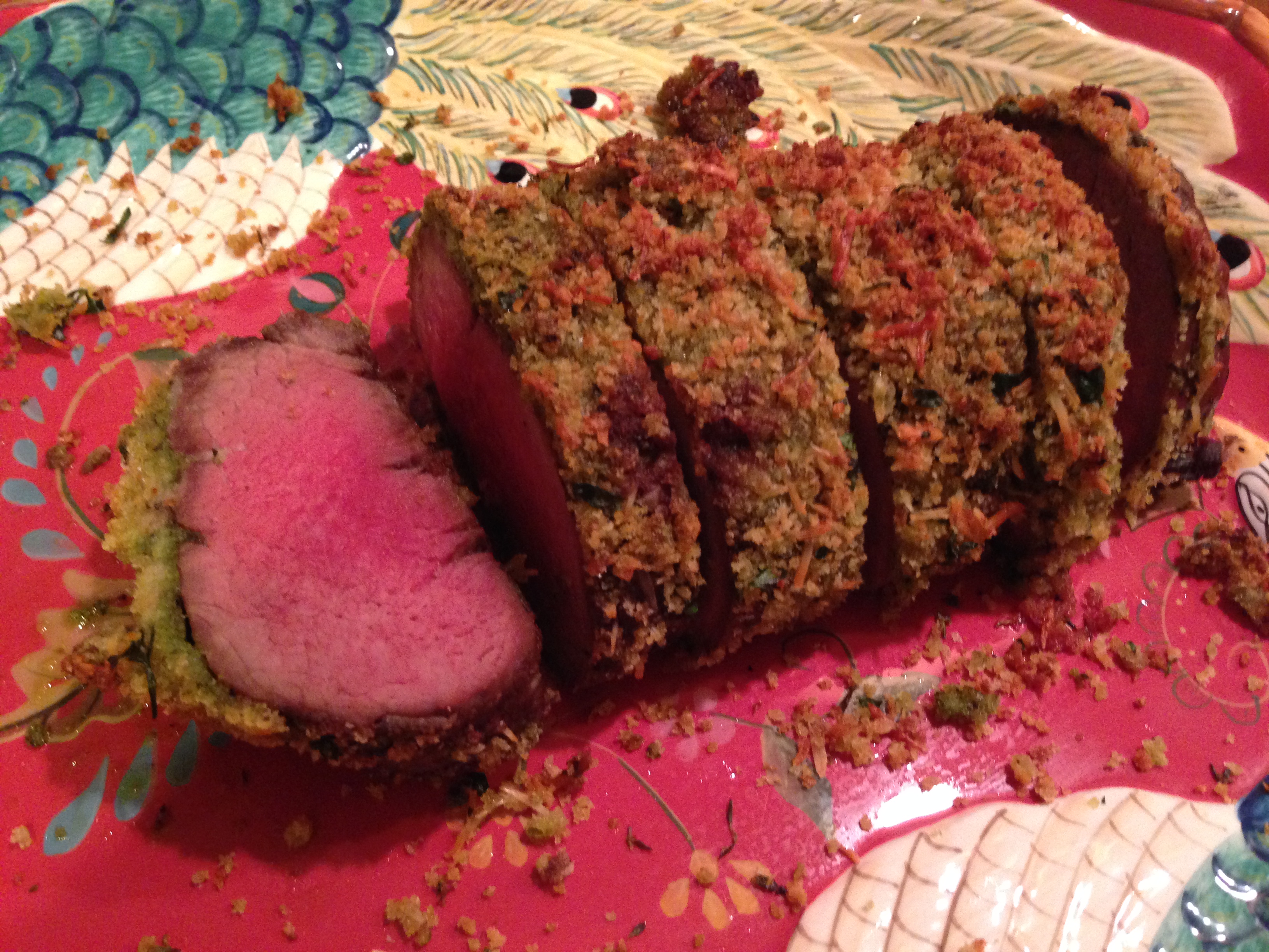 After the tenderloin has set at room temperature for 2 hours, adjust oven rack to upper-middle position and preheat the oven to 400 degrees. Roast tenderloin for 20 minutes, then remove from oven. Using scissors, cut and remove twine. Coat tenderloin with herb paste, followed by bread-crumb topping. Place back in the oven (same temperature) and roast until thickest part of meat registers about 130 degrees (for medium-rare) and topping is golden brown, 20 to 25 minutes. (Use an instant read thermometer.) (If topping browns before meat reaches preferred internal temperature, lightly cover with foil for remainder of roasting time and remove while roast rests.)