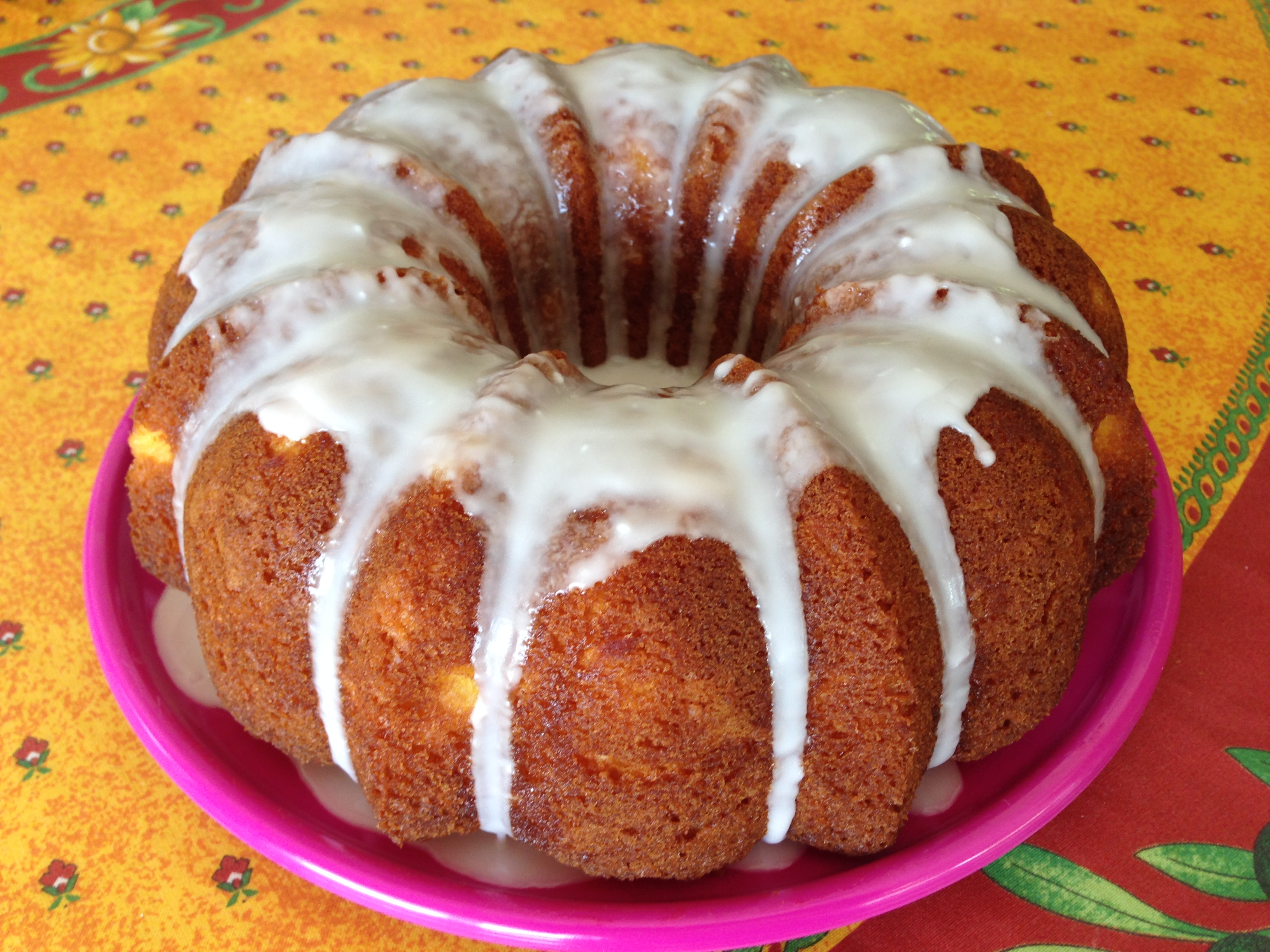 When cake is cool, turn onto serving plate. Whisk together remaining glaze with confectioner’s sugar until smooth and drizzle over top of cake.