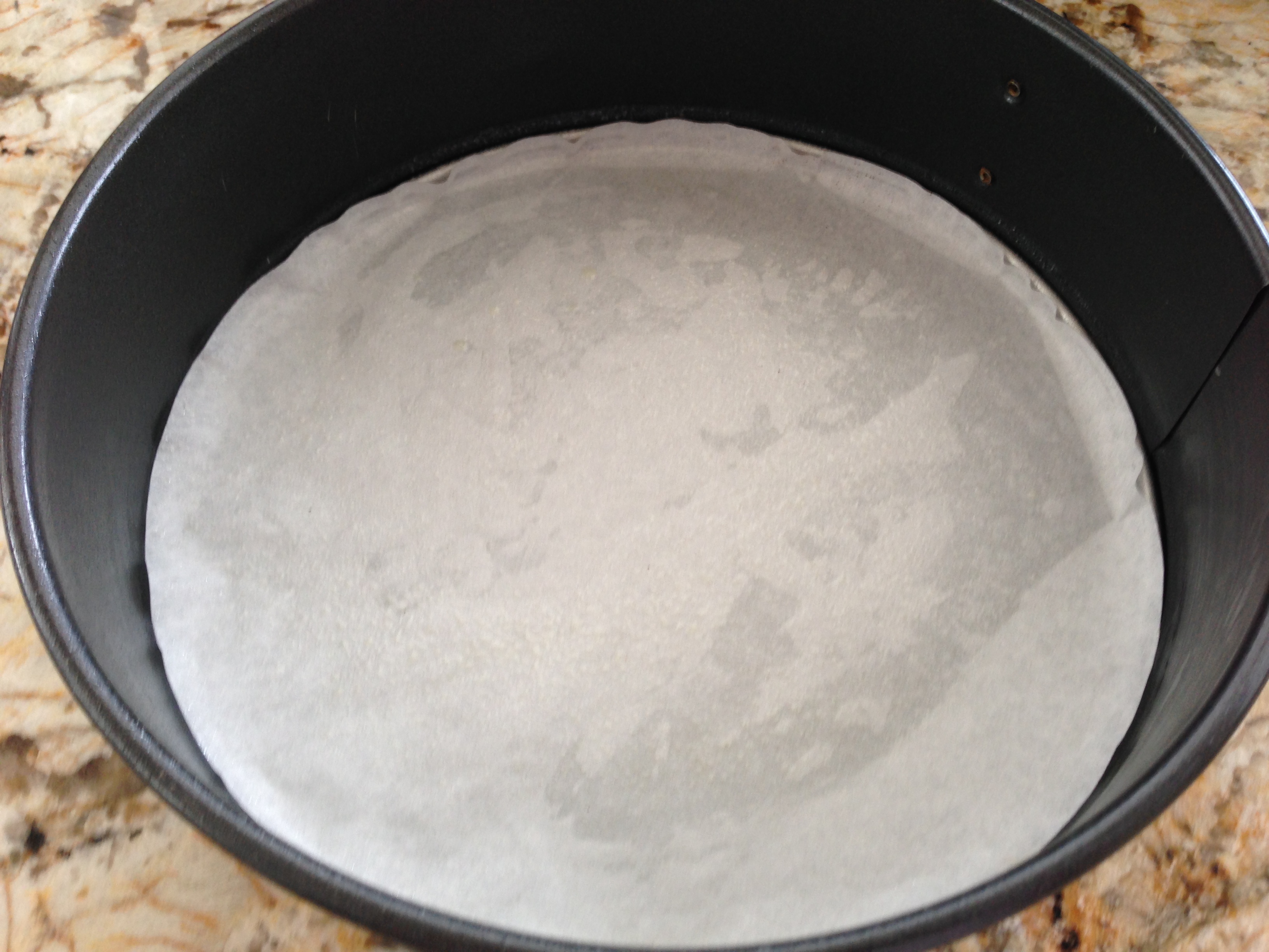 have lined with a round piece of wax paper, cut to size. Press firmly the crumb mixture onto the bottom and up the sides evenly. Try to make the crust about 1/8 inch evenly all around.