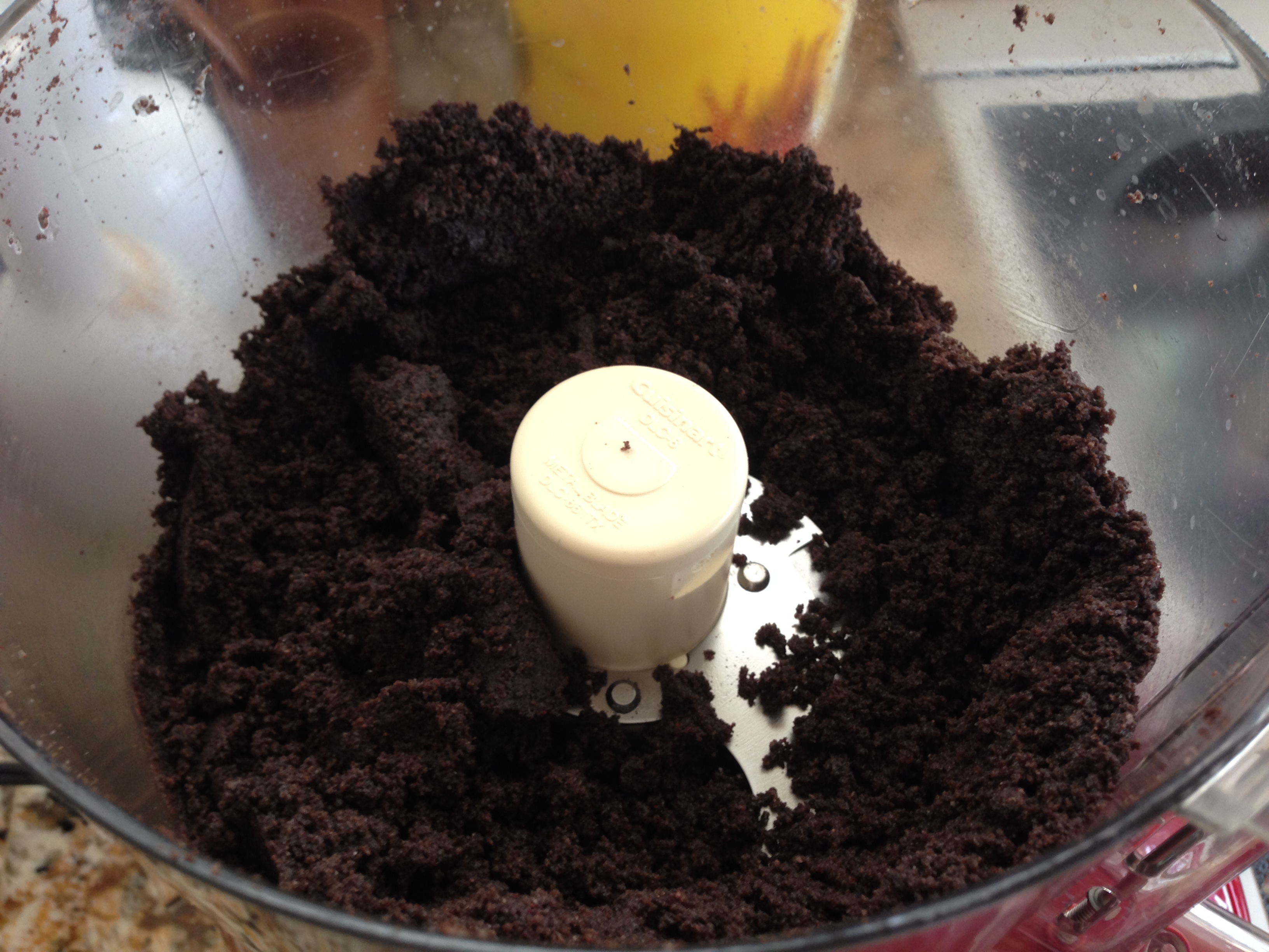 In a food processor, add the Oreo cookies and blend until the texture is like coarse meal or