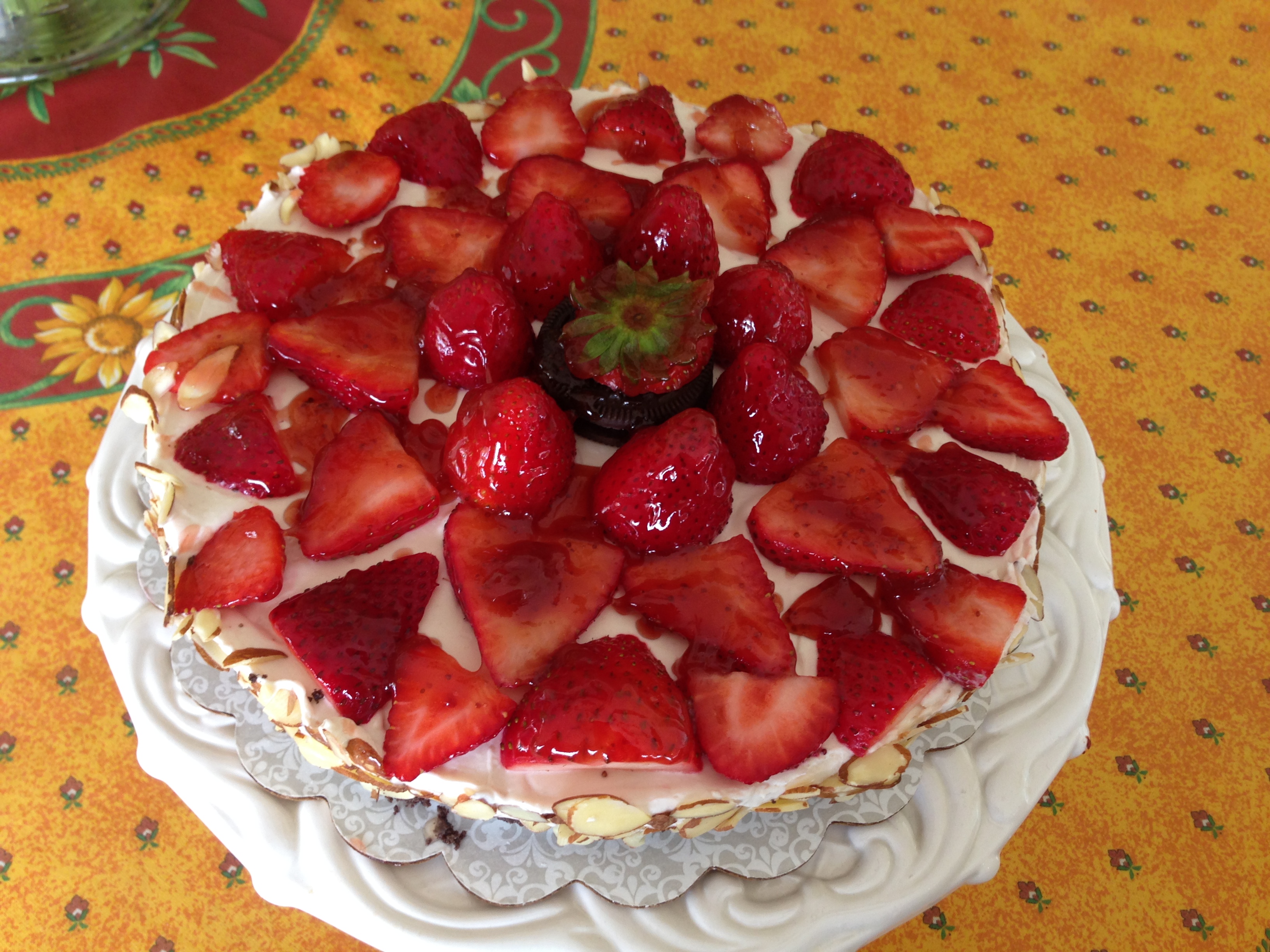 Before serving, remove the cheesecake from the springform pan. Make sure to run a very sharp knife around the side of the pan for easier removal. (Take care to remove the cheesecake from the bottom of the spring-form pan, you might have to use a thin knife to help lift the bottom in one spot to get started, it helps to use a very flat spatula: also, be careful not to break the cheesecake.) Place on a serving dish. Use the remaining strawberry slices to decorate the top and around the sides. (see pictures).