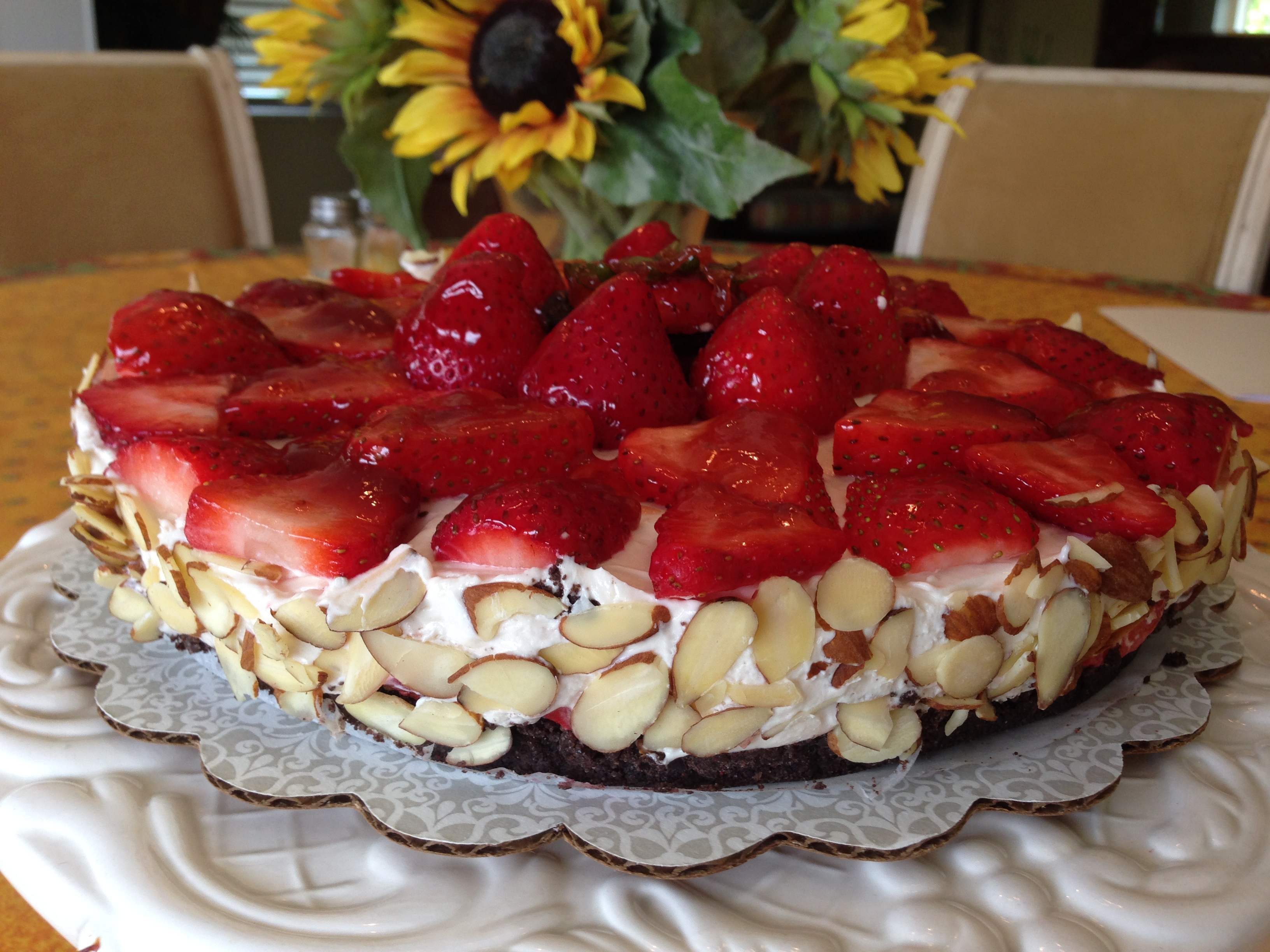 microwave for 30 seconds. Brush melted jelly on top of the strawberries. (If you chose to decorate with sliced almonds, hold the entire pie with one hand from the bottom over the sink and use your hands to scoop almonds and pat around the sides of the pie, making sure most stay on the pie, the rest will fall into the sink). Keep the decorated pie in the refrigerator until ready to serve. Cut while semi-frozen, it will be easier to cut and serve. Place it on a dessert plate that has been drizzled with Strawberry Coulis. It will thaw fast. Serves 8
