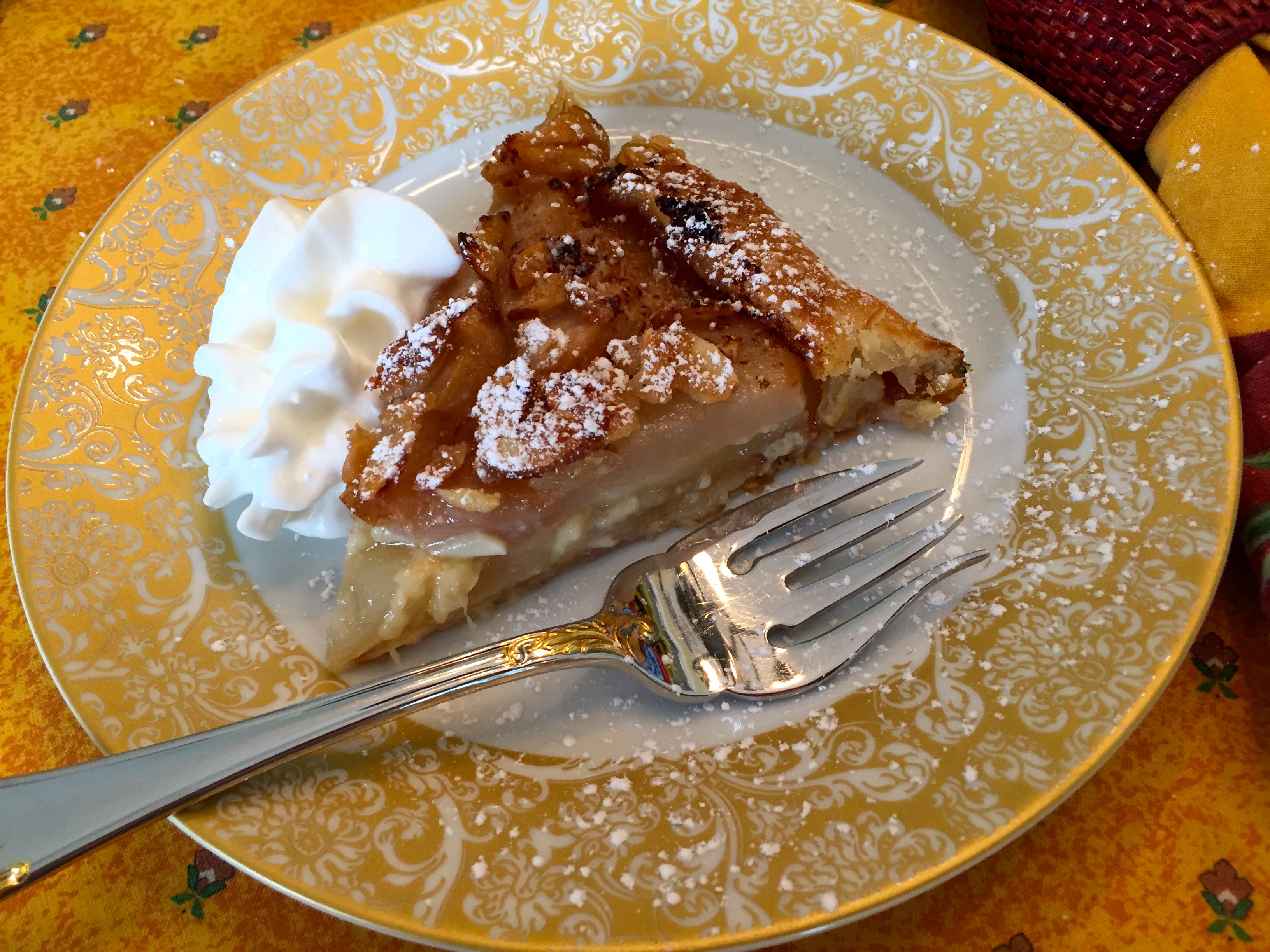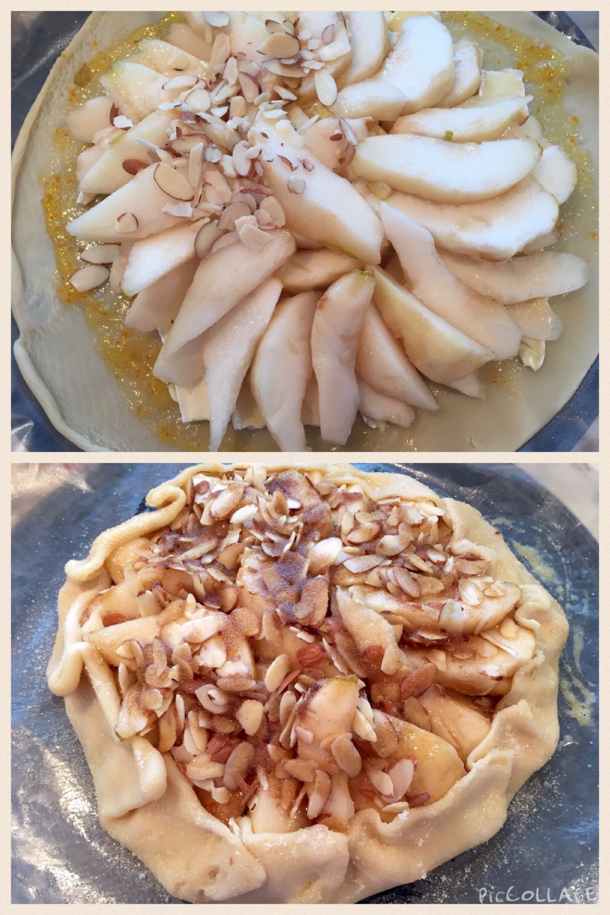 Peel and core the pears. Cut the pears into thin slices. Overlap them around the exterior of the pie crust, then place some in the center in a circular arrangement. Keep adding the pear slices around the pie in a circular fashion, all the pears facing one way, until you’ve used all the slices. Sprinkle the sliced almonds on top of the pears. Roll the edges of the pie up and pinch at intervals to make it look rustic.