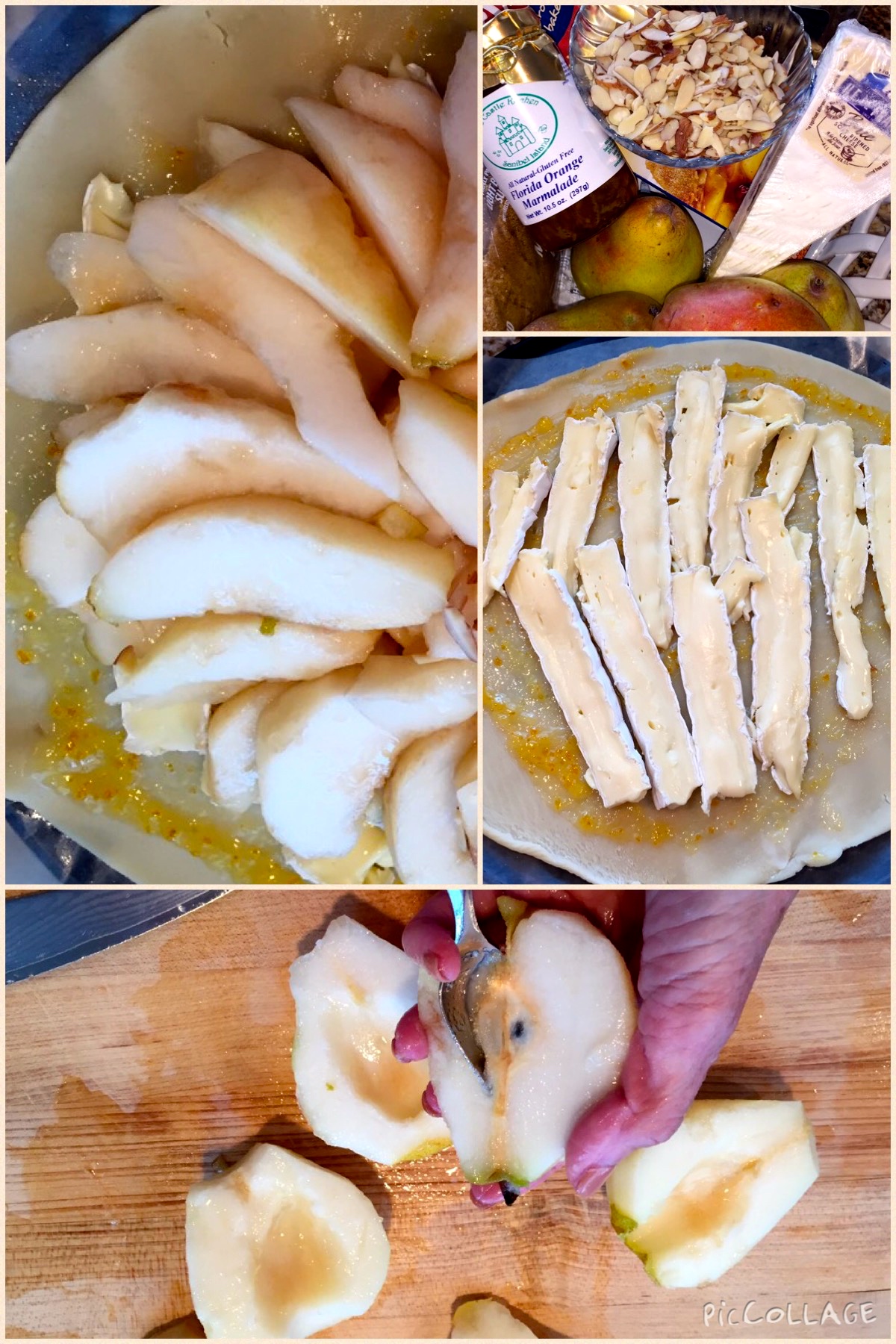 Brush 1 T of the apricot or orange marmalade around the top of the pie crust, leaving about 1 1/2 inch without jam. Cut the wedge of brie into thin strips and place on the top of the jam, covering the bottom, but leave about 1 1/2 inch without the brie around the perimeter. Press around evenly.