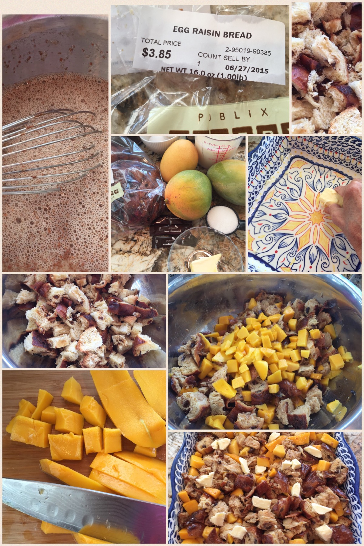 Preheat the oven to 350 degrees. Lightly butter a 9×11 or 10×10 square glass baking dish, set aside. Cut the loaf of raisin bread in small, bite size pieces and place in a large bowl. Peel and cut* the mangos into small bite size pieces and add to the bread bowl.