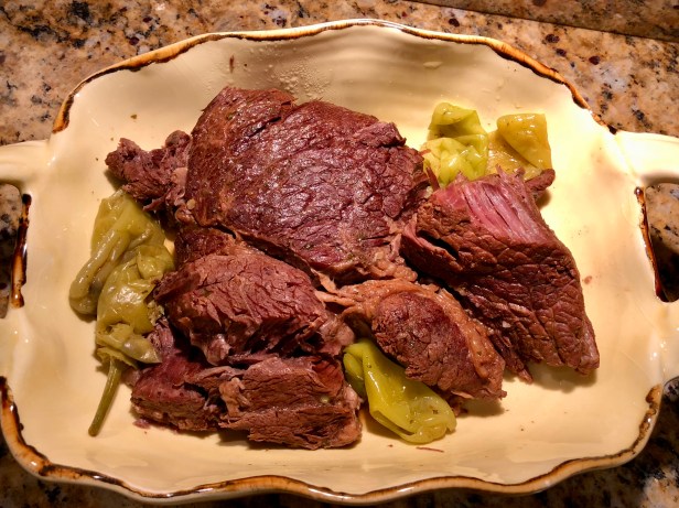 Put your Instant Pot on Saute for 5 minutes to heat up. Pour the broth and Pepperoncini juice in the pressure cooker. Add the roast. Sprinkle the dressing mixes over the roast. Then top with butter and pepperoncinis. Cook on Pressure Cooking setting (manual) for 1 hour and 30 minutes (90 min.). Put “warming” cycle to off. After cooking time, use natural release for 15 minutes and then switch to quick release.