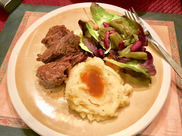 Serves 4 (Note: I like to poor all the cooked liquid in a bowl and let it settle. Then I spoon out all the oil, leaving all the delicious gravy. You can drizzle some of this gravy on the mash potatoes and over the meat when served)