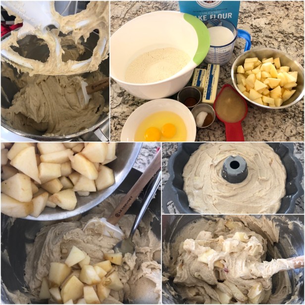 Fold in the apples by hand and then transfer the mixture to the 9 inch Bundt pan. (The batter will be thick!). Bake at 350 degrees for 1 hour and 20 minutes or until a toothpick inserted in the center comes out clean. Remove from oven and set on cooling rack. Allow the cake to cool for 10 minutes, and then remove from the pan.