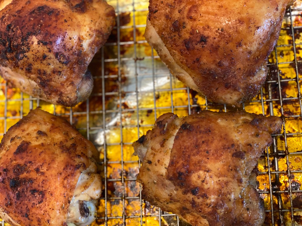 Since most of the grease drips to the bottom while cooking this is a healthier version of chicken thighs!