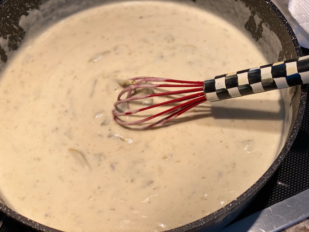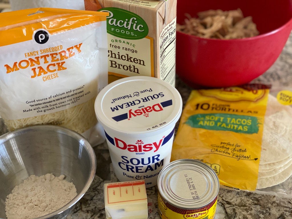 In a sauté pan, melt butter and stir in flour, cook for 1 minute. Add broth and whisk until smooth. Heat over medium heat until thick and bubbly (about 6 min.). Stir in sour cream and chilies. Take off the burner, you don’t want to curdled sour cream.