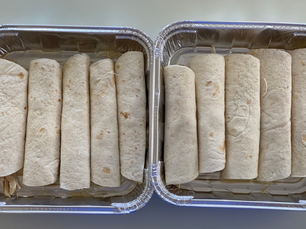 Mix chicken and 1 cup cheese. Roll up the chicken mixture in the tortillas and place, bottom side down in the pan. (I put 5 rolls in 2 separate pans).