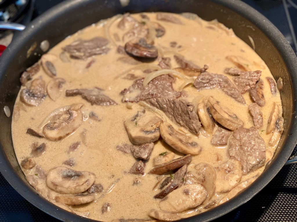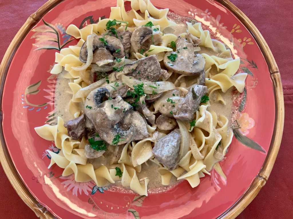 To serve, place noodles on plate and add a serving of beef, mushrooms, and juice. Garnish with a little parsley. Serves 4