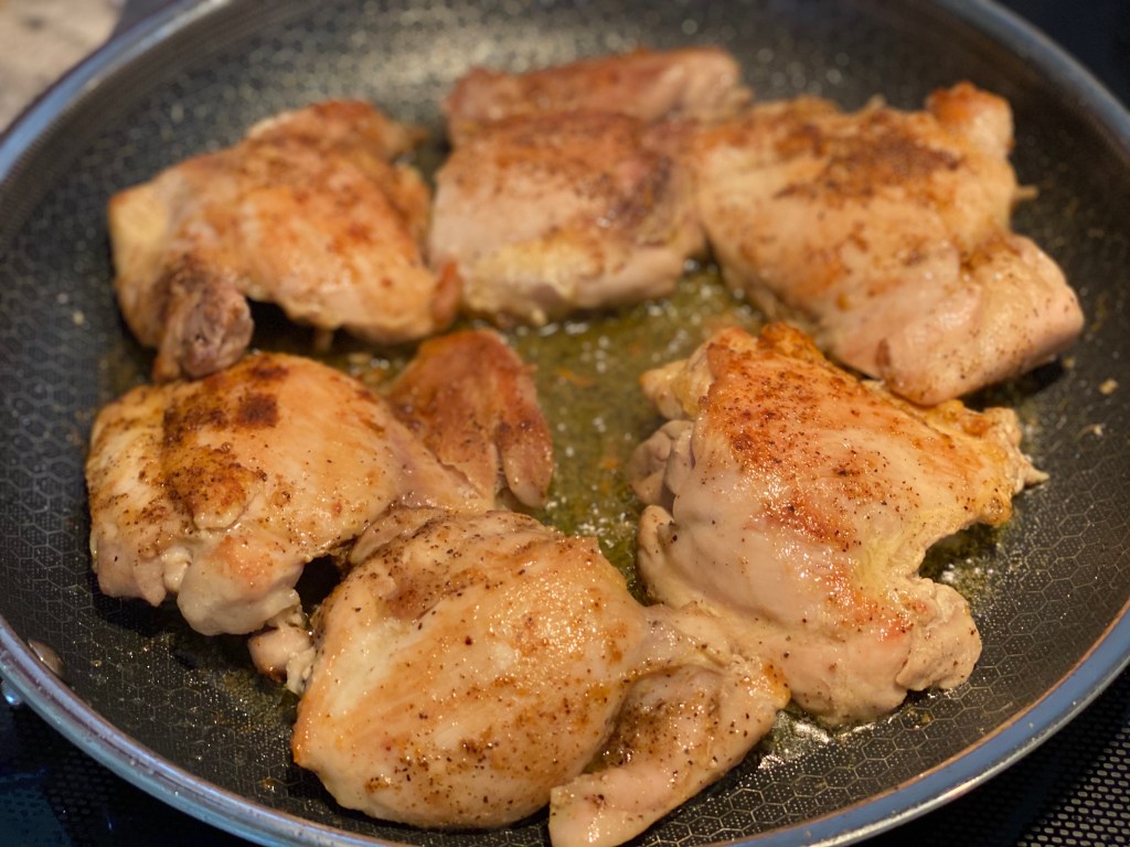 In a large frying pan, heat olive oil over medium-high heat. Season thighs with salt and pepper on both sides. Saute chicken until browned on both sides, approximately 4 minutes each side. Set chicken aside. Pour out all the oil in the pan except for 1 tablespoon.