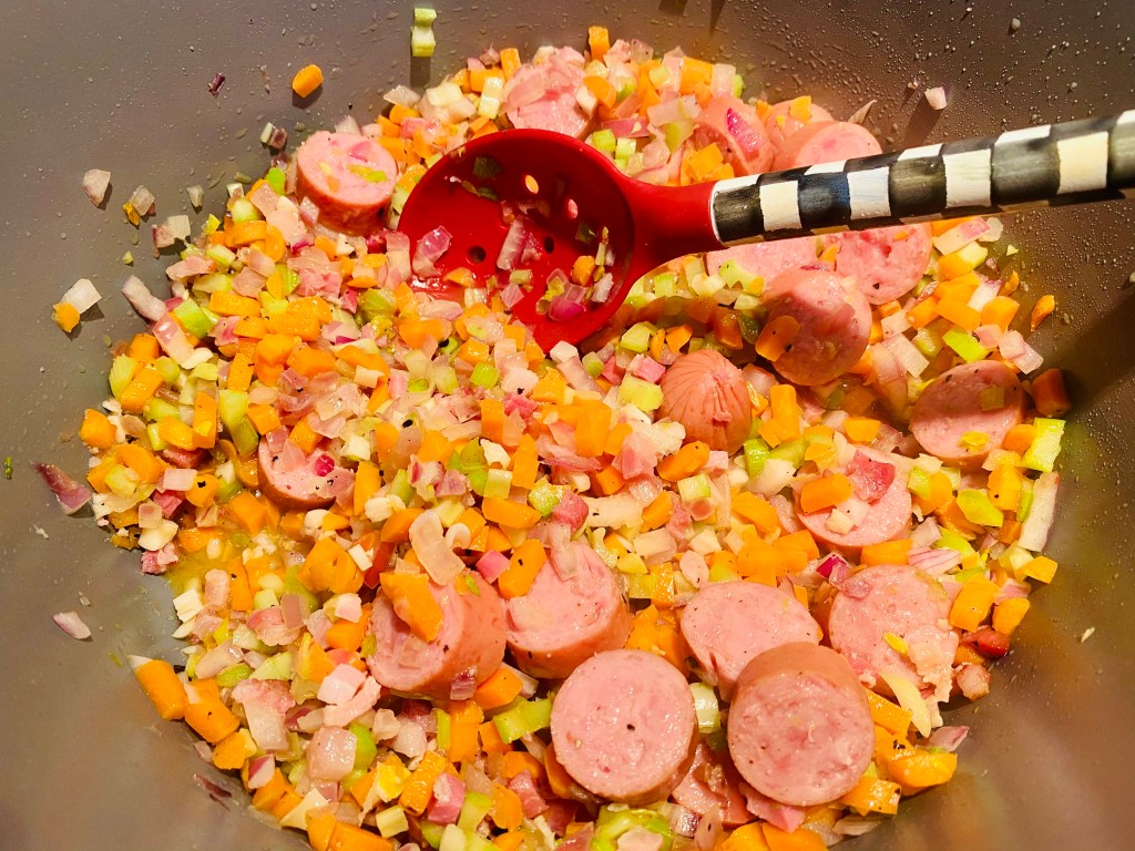 Heat the oil in a large Dutch oven. Cook the pancetta and Kielbasa in the oil for about 3 minutes. Add the onion, carrot, and celery and cook for 3 minutes or until it softens. Add the garlic and cook 1 minute more.