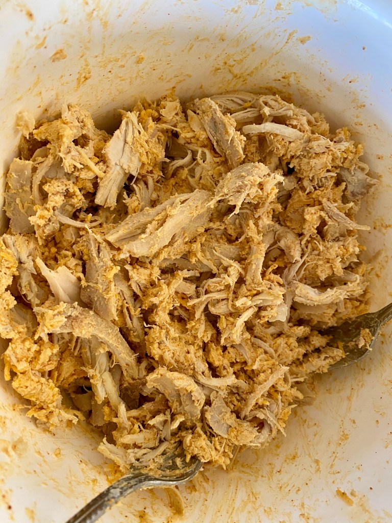 In a medium bowl, stir together the room temperature cream cheese (if you just take it out of the oven, put in microwave for 20 seconds), Mexican cheese, and taco seasoning. Fold in the shredded chicken.