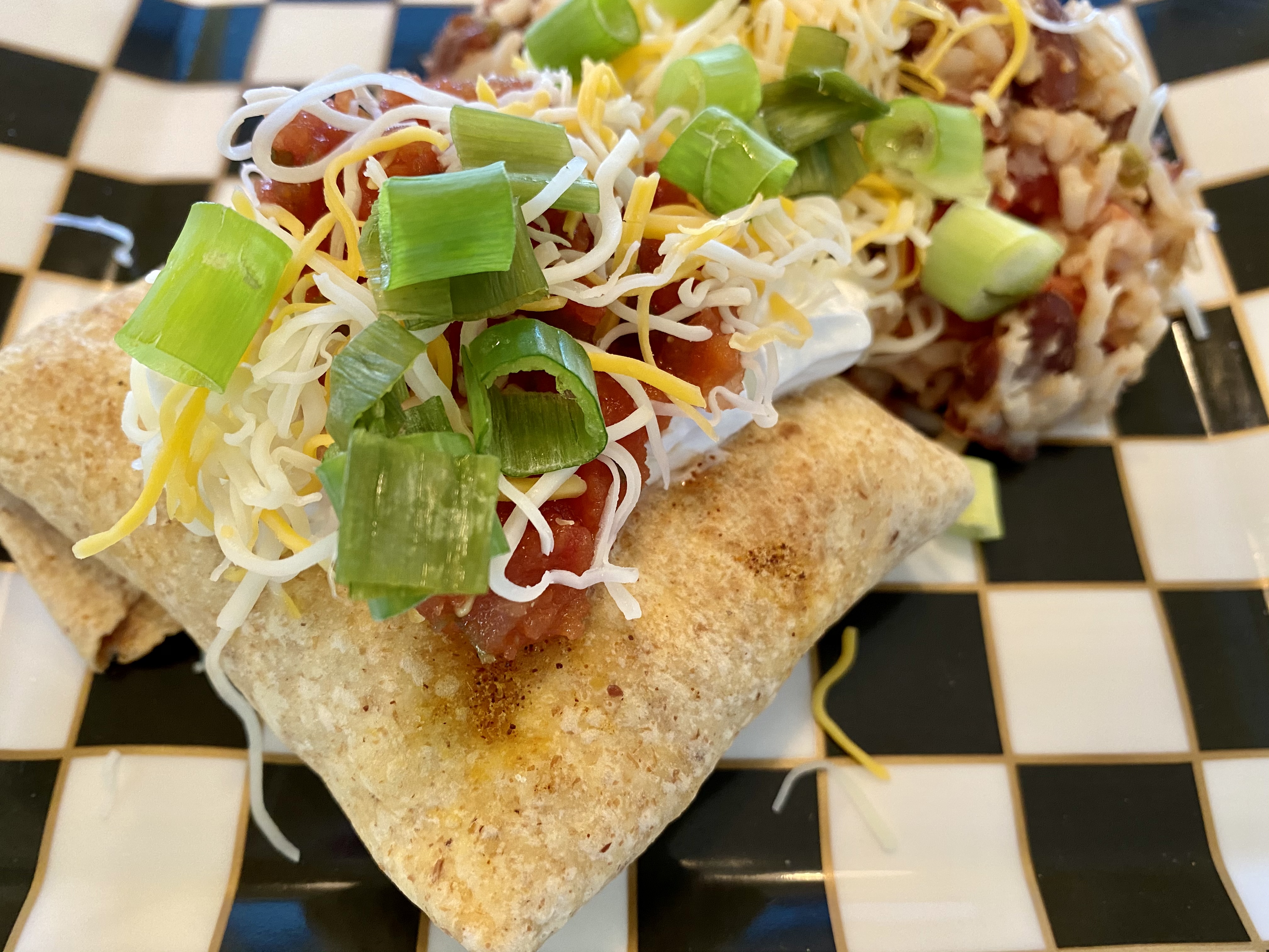 Place about 1/2+ cup of the chicken mixture in the center of the flour tortillas, fold in the sides, then fold in the top and bottom. Lay seam side down on the wire grates on the cookie sheet. Spray tops of tortillas with the cooking spray. Lightly sprinkle with some of the taco seasoning. Bake for 15 minutes. At the end of 15 minutes flip the tortillas and spray again with the olive oil spray. Bake another 15 minutes. (flip again and put the broiler on and broil top side for about 2 minutes, keeping close eye on them, they can burn fast).