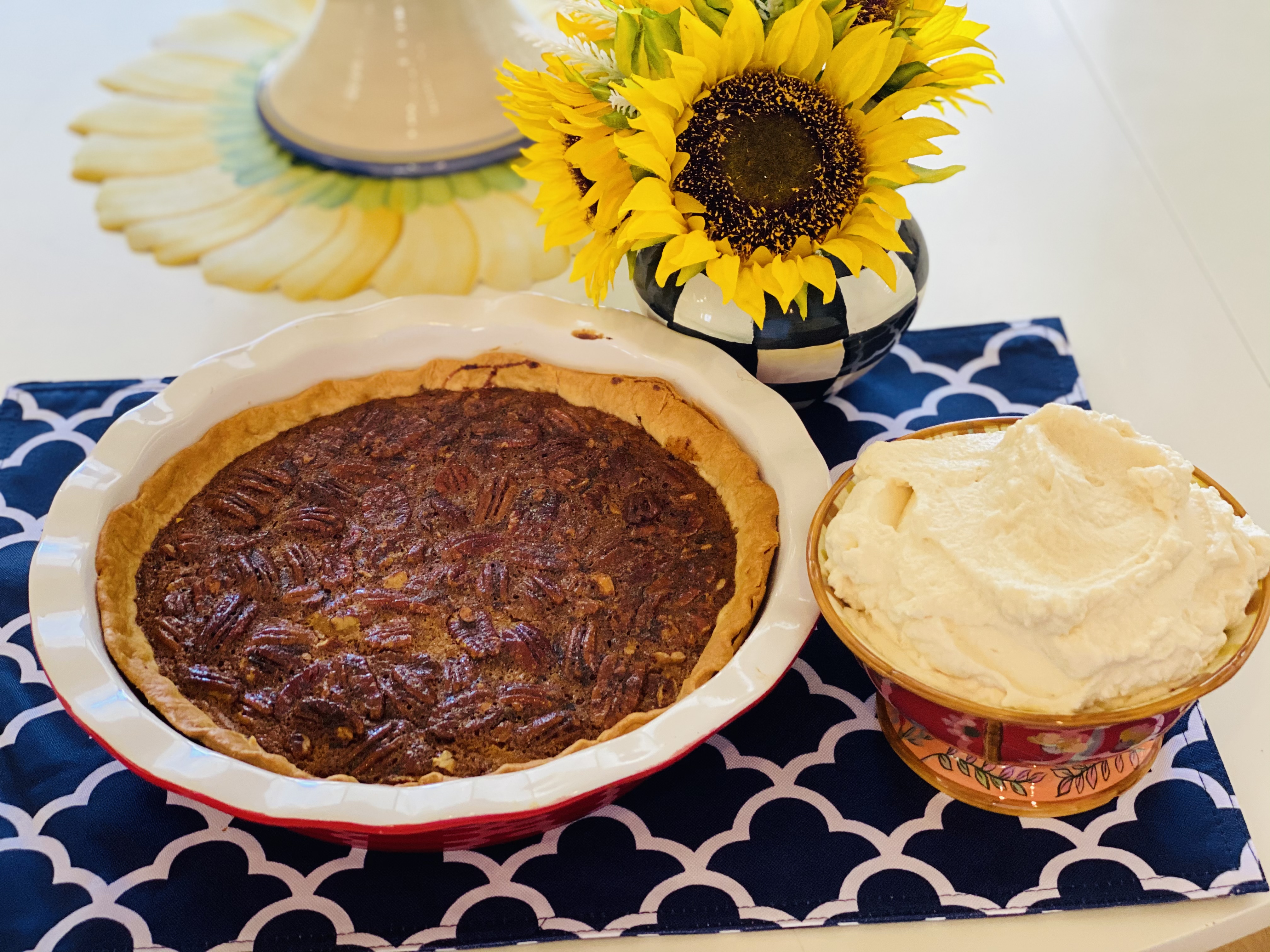 Pour the pumpkin pie mixture into the pre-baked pie shell then sprinkle the top with 1/3 cup chopped pecans. (This helps creates a barrier so the pumpkin pie and pecan pie fillings stay separated.) Carefully, ladle the pecan pie filling over top of the pumpkin layer, be careful not to mix the layers.