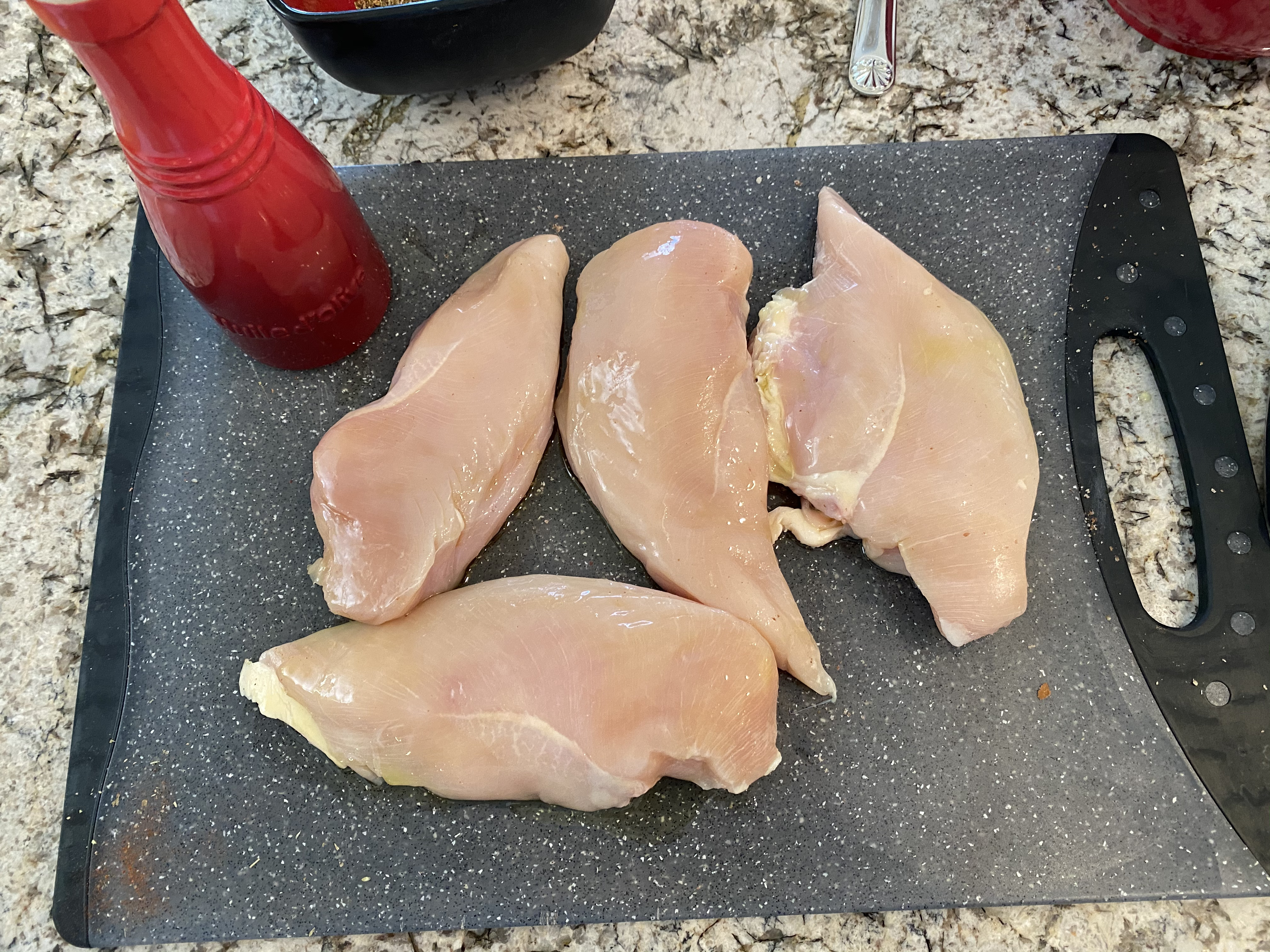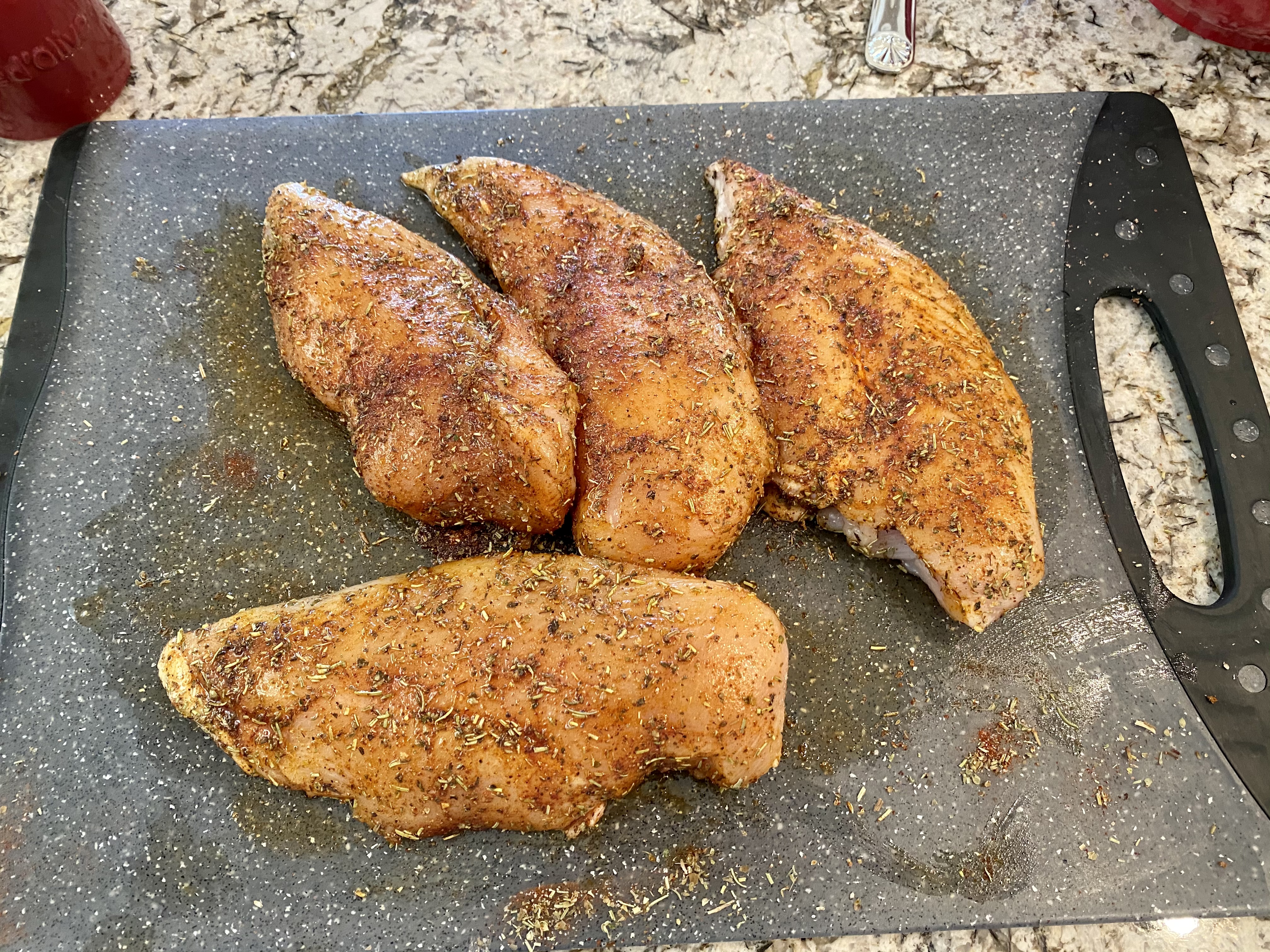 Rub chicken breast with olive oil on each side., Coat the chicken throughly with spice mix rub.