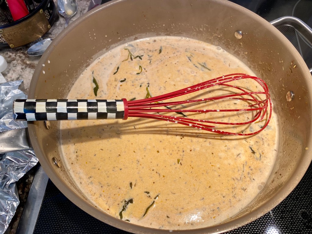 Add the remaining 2 tablespoons of butter to the skillet over medium heat. Add minced garlic and sage. Cook, stirring frequently, for about 1 minute. Gradually whisk in heavy cream and cook until slightly thickened, for about 4-5 minutes. Taste and adjust for salt and pepper. Remove and discard sage leaves.