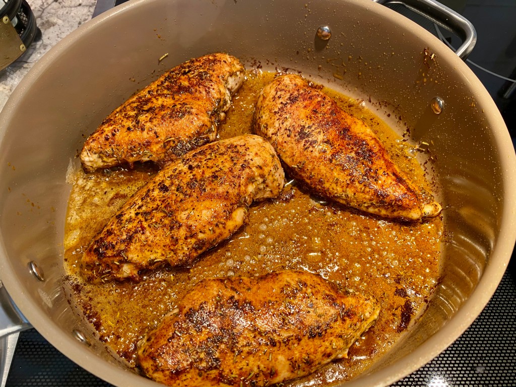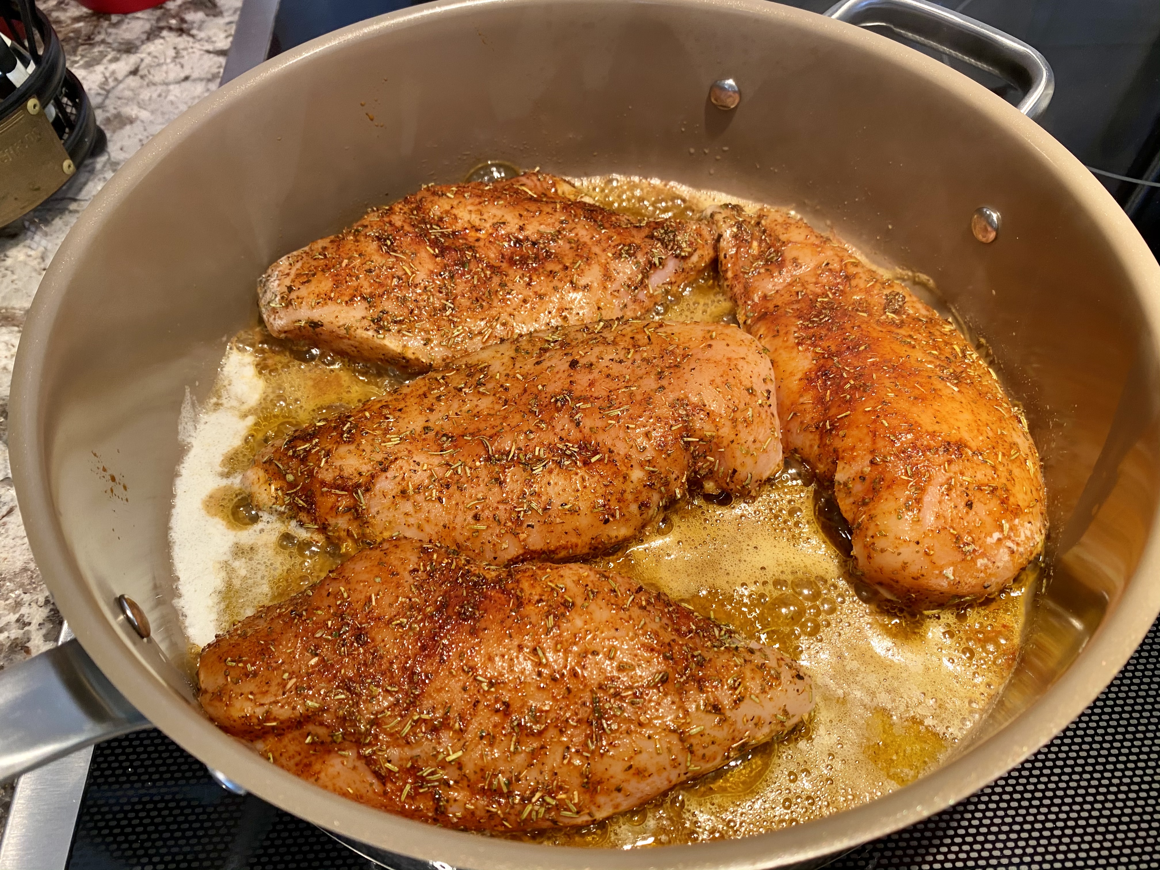 Add 2 tablespoons of butter and 3 tablespoons olive oil to a large skillet over medium high heat. Once the butter has melted, add chicken breast and cook for about 4-5 minutes on each side. Flip the chicken only once to allow it to sear. Remove chicken from pan and set aside on a plate cover with foil.