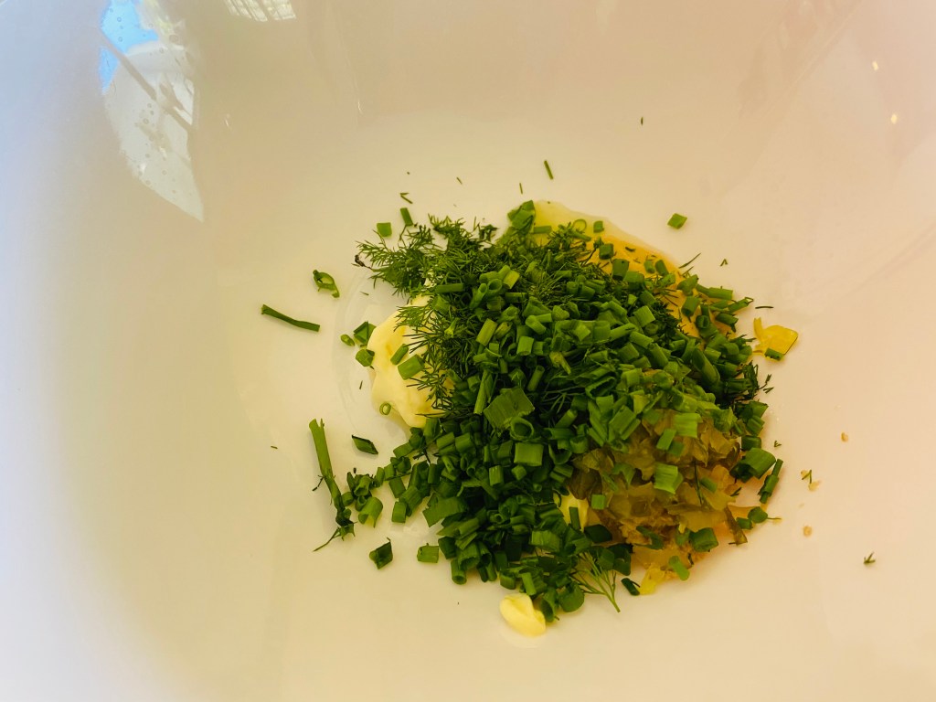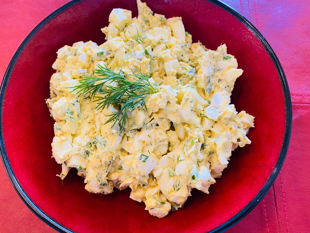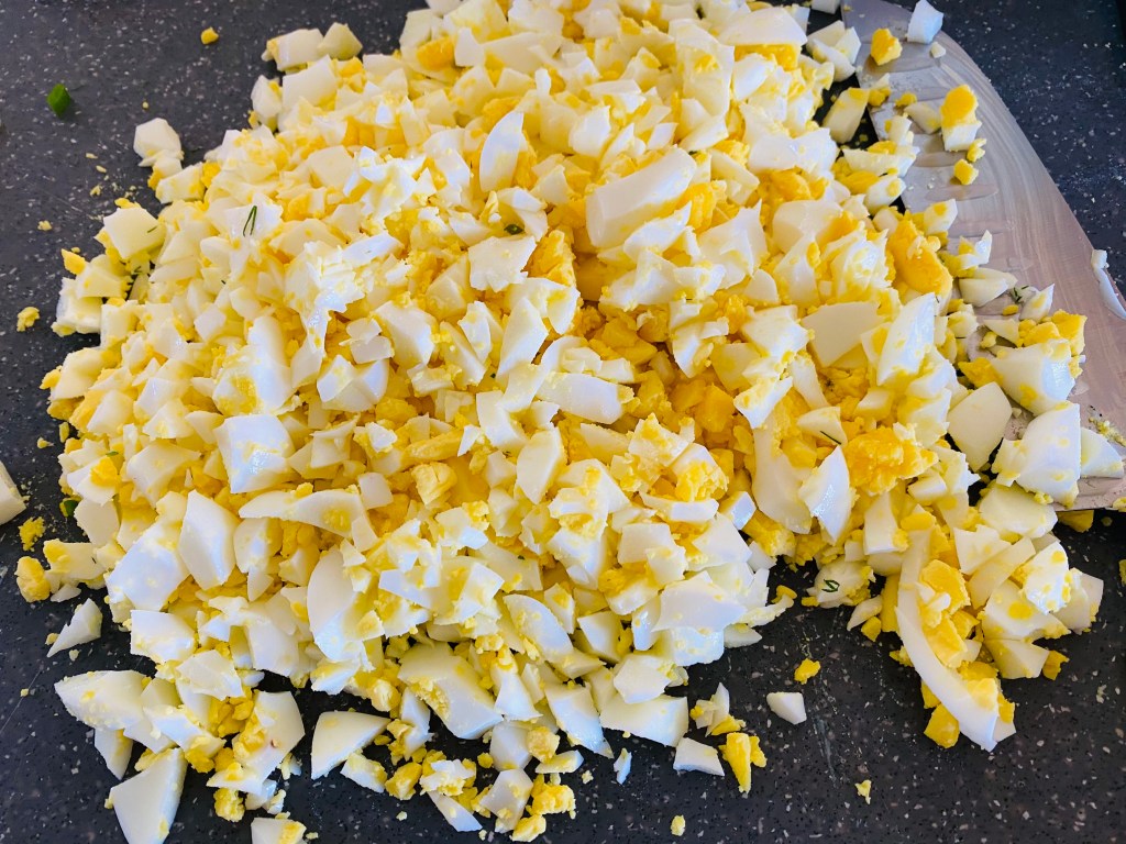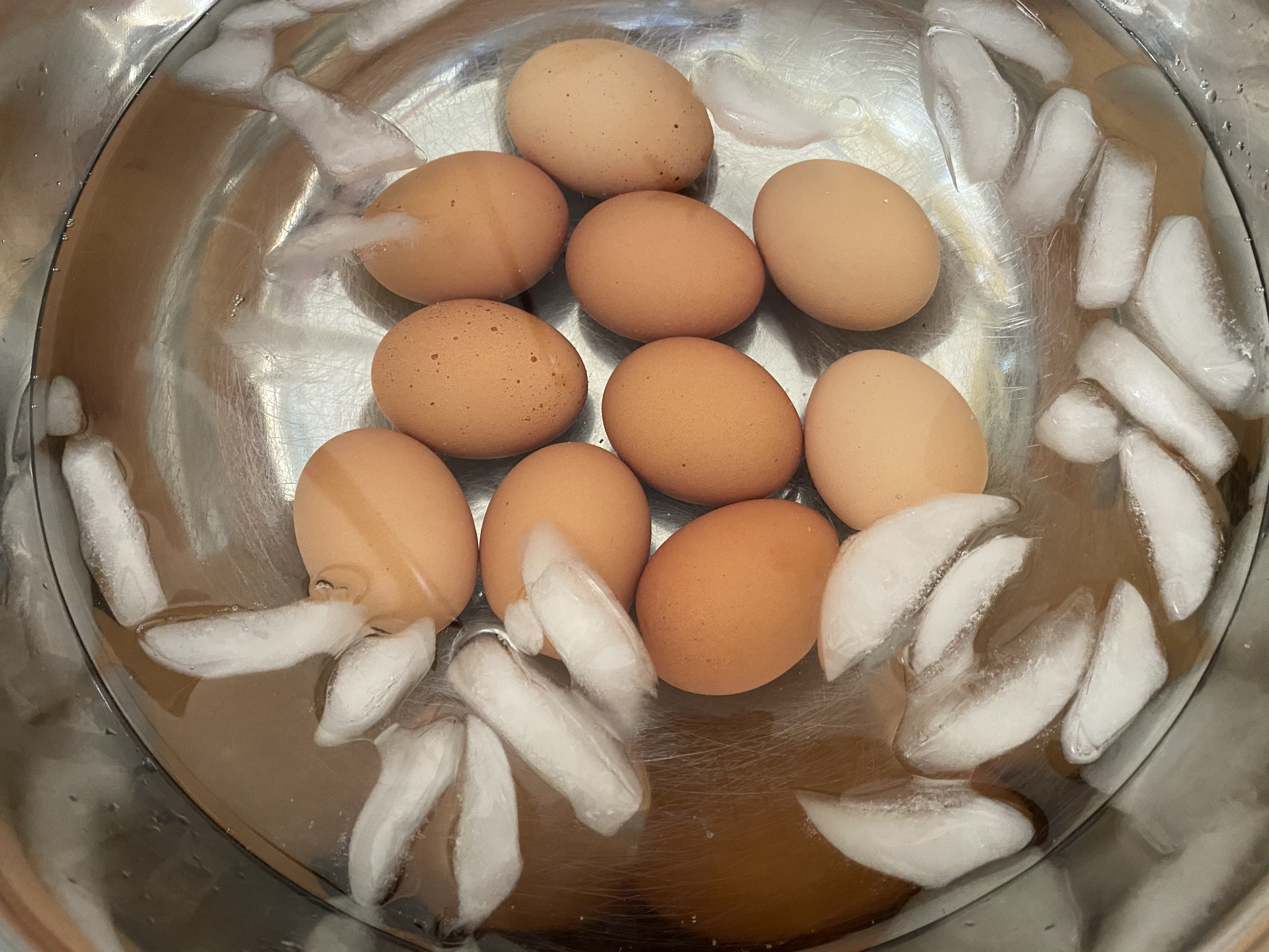 Bring a large pot of water to a rolling boil over high heat. Pour in the vinegar, which helps with the smell. Gently add the eggs into the boiling water using a slotted spoon and cook for 6 minutes. After 6 minutes, take the pot off the stove and put a lid on the pot and let it sit for another 6 minutes. Immediately place the eggs into a pan filled with cold water and ice. Let cool for 2-4 minutes to stop the cooking process. Peel under lukewarm water, then chop or serve as desired.