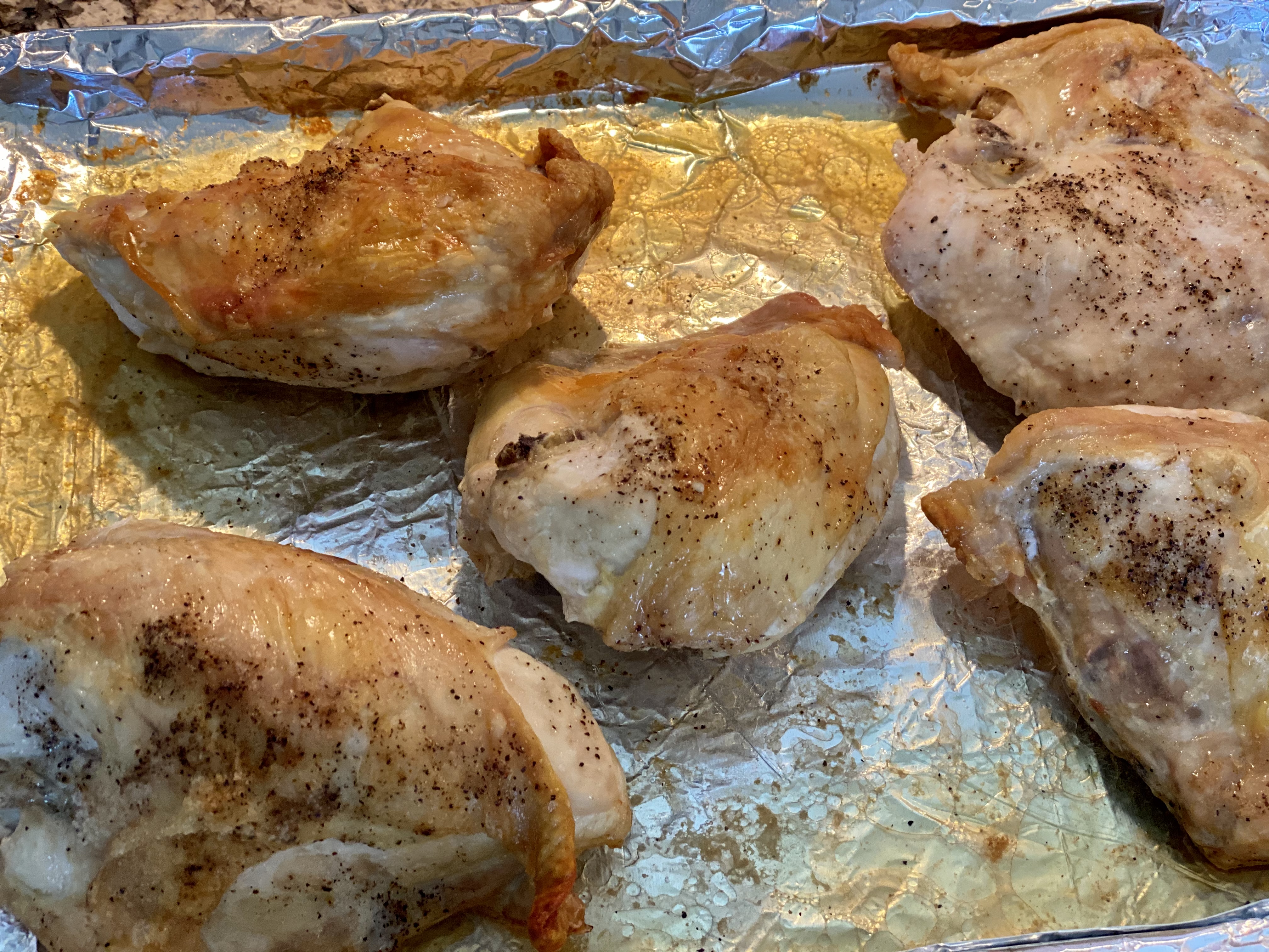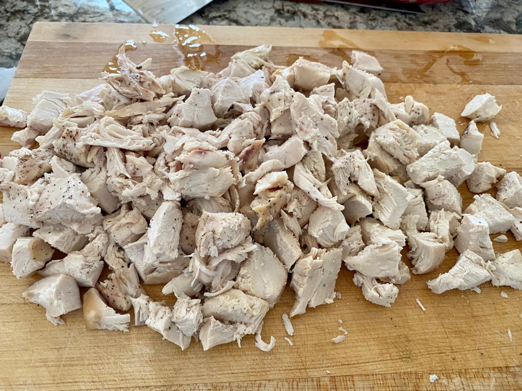 Preheat the oven to 425 degrees. Line a baking sheet with aluminum foil. Arrange chicken breast skin side up on baking sheet. Coat with olive oil and sprinkle both sides with salt and pepper. Roast for 30 to 35 minutes, or until done. Let cool.