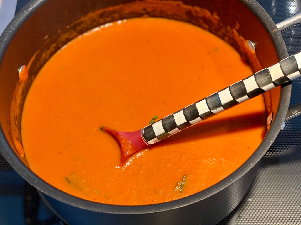 Add the soup back to the pot if using a food processor. Stir in the cream, salt and pepper. Chiffonade a bunch of basil leaves (around 7-8) and add it to the soup. Stir and keep warm until ready to serve.