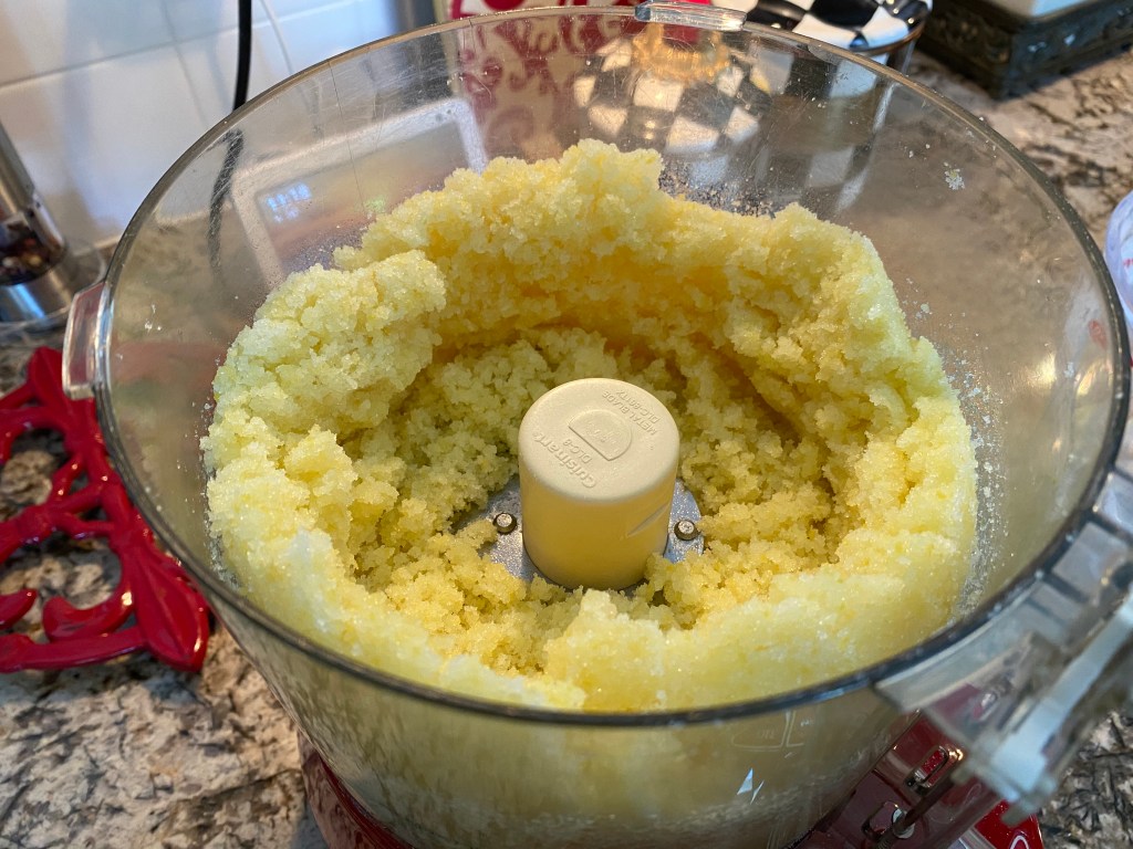 Using a carrot peeler, remove the zest of 3 lemons, being careful to avoid the white pith. Put the zest in a food processor and pulse. Add the sugar and pulse until the zest is very finely minced into the sugar.