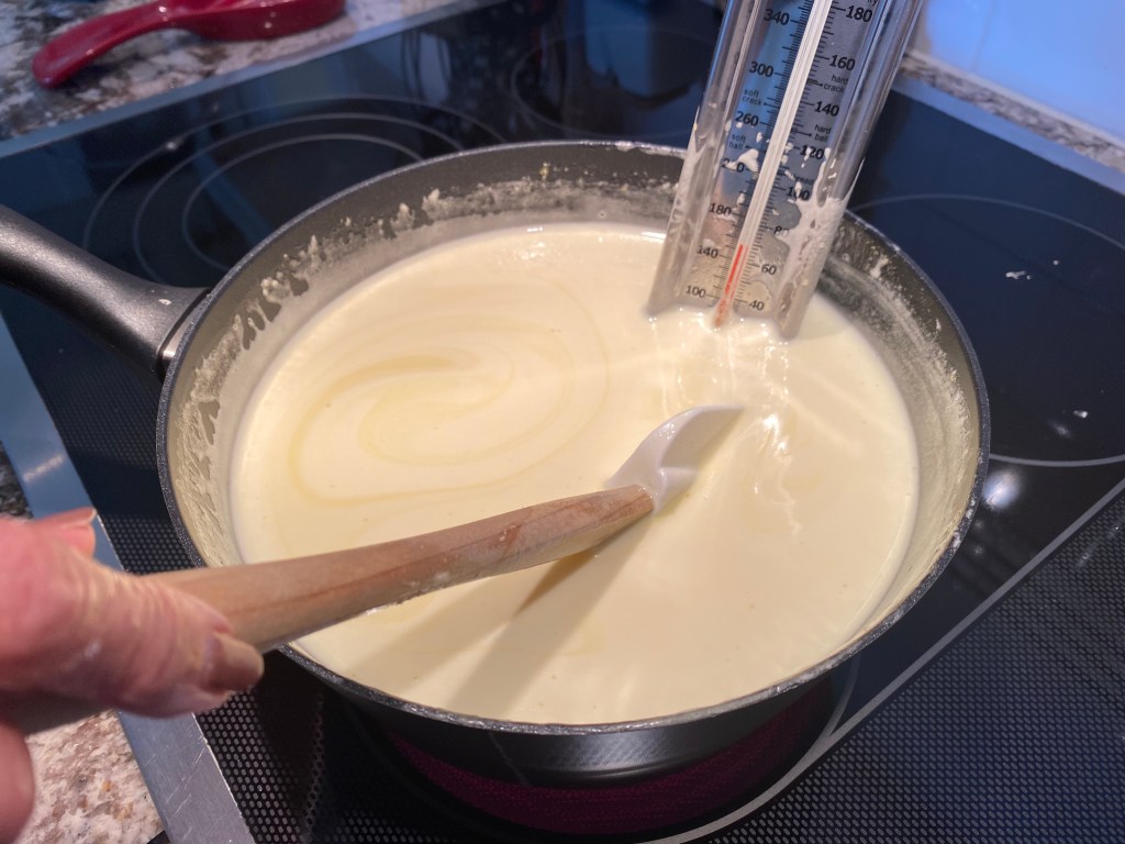 Pour the mixture into a 2 quart saucepan and cook over low heat until thickened (about 10 minutes), stirring constantly. (I used a thermometer to reach 170 degrees). The lemon curd will thicken at about 170 degrees. Remove from heat and refrigerate.