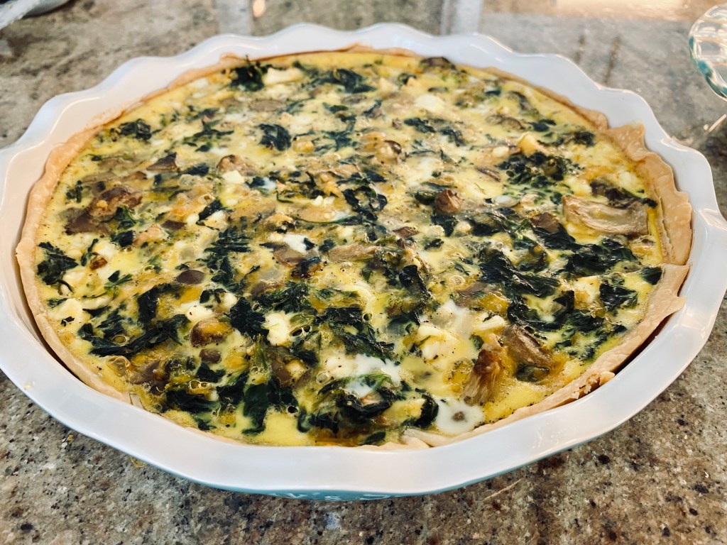 Heat olive oil in large skillet over medium high heat. Add the onion and mushrooms and sauté until softened, about 5 to 7 minutes. Add in garlic and cook 1 minute more. Place a paper towel in fry pan and soak up any liquid, discard paper towel. Turn heat off and stir in spinach (make sure you squeezed with your hands the spinach and take as much water out as possible, blotting with paper towels), feta, and cheddar cheese. Sprinkle lightly with salt and pepper. Spoon mixture into the prepared pie plate.