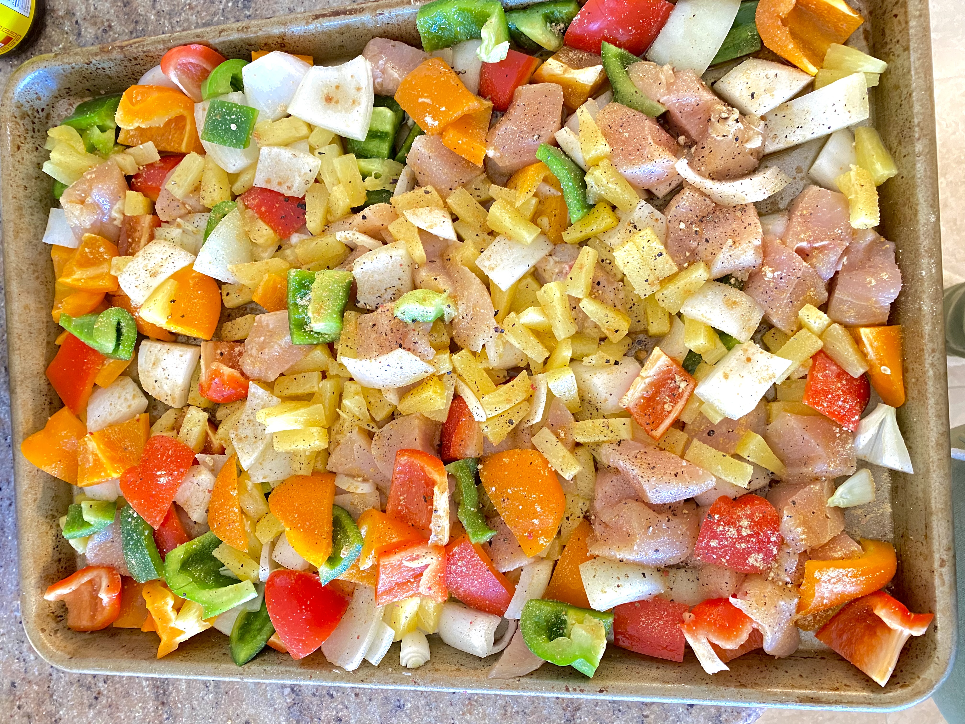 Preheat the oven to 400 degrees. Slice the onion, bell peppers, and chicken breasts into one inch sections. Drain the pineapple well, reserving the juice. Mix and evenly spread the onion, bell pepper, chicken, and pineapple on a large sheet pan. Drizzle the sesame oil over the ingredients on the sheet pan. Next sprinkle the garlic powder, ground ginger, and a pinch or two of salt and pepper. Toss until evenly coated in oil and spices.