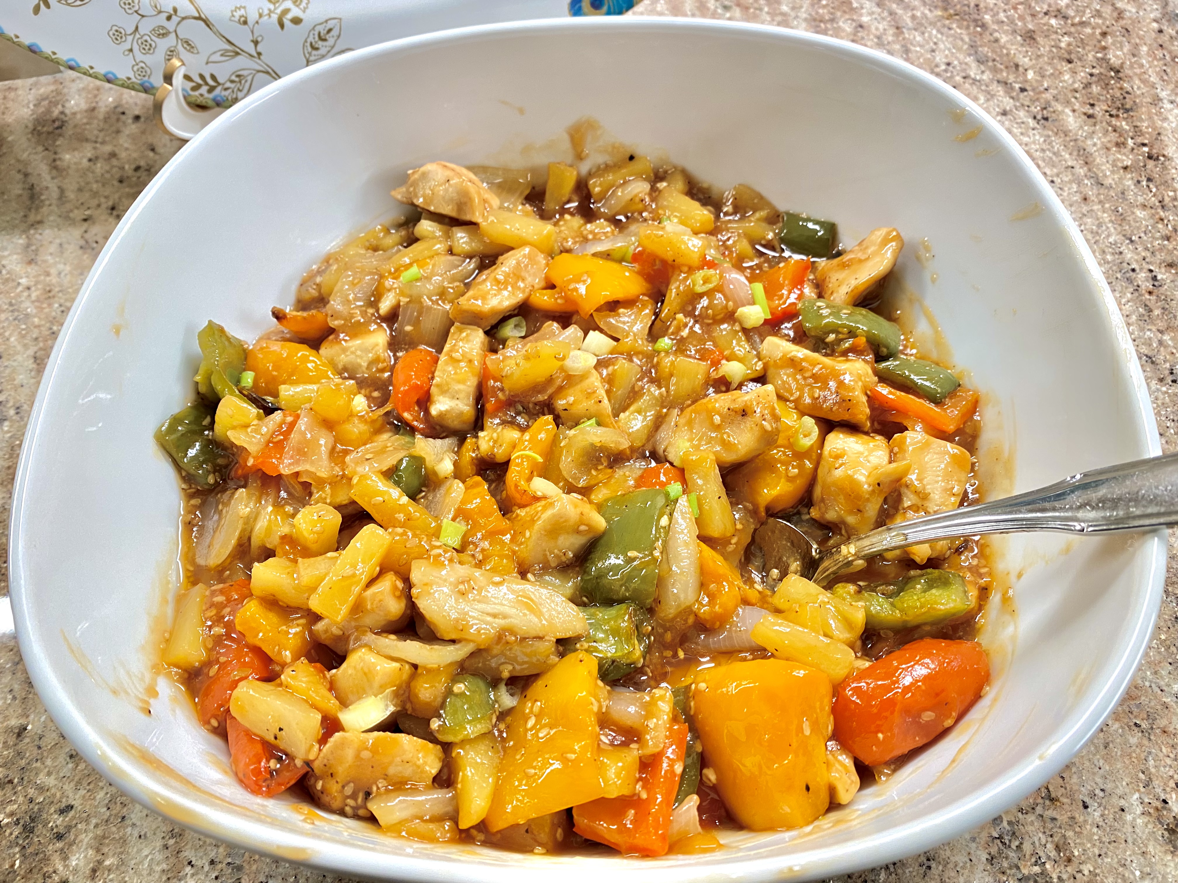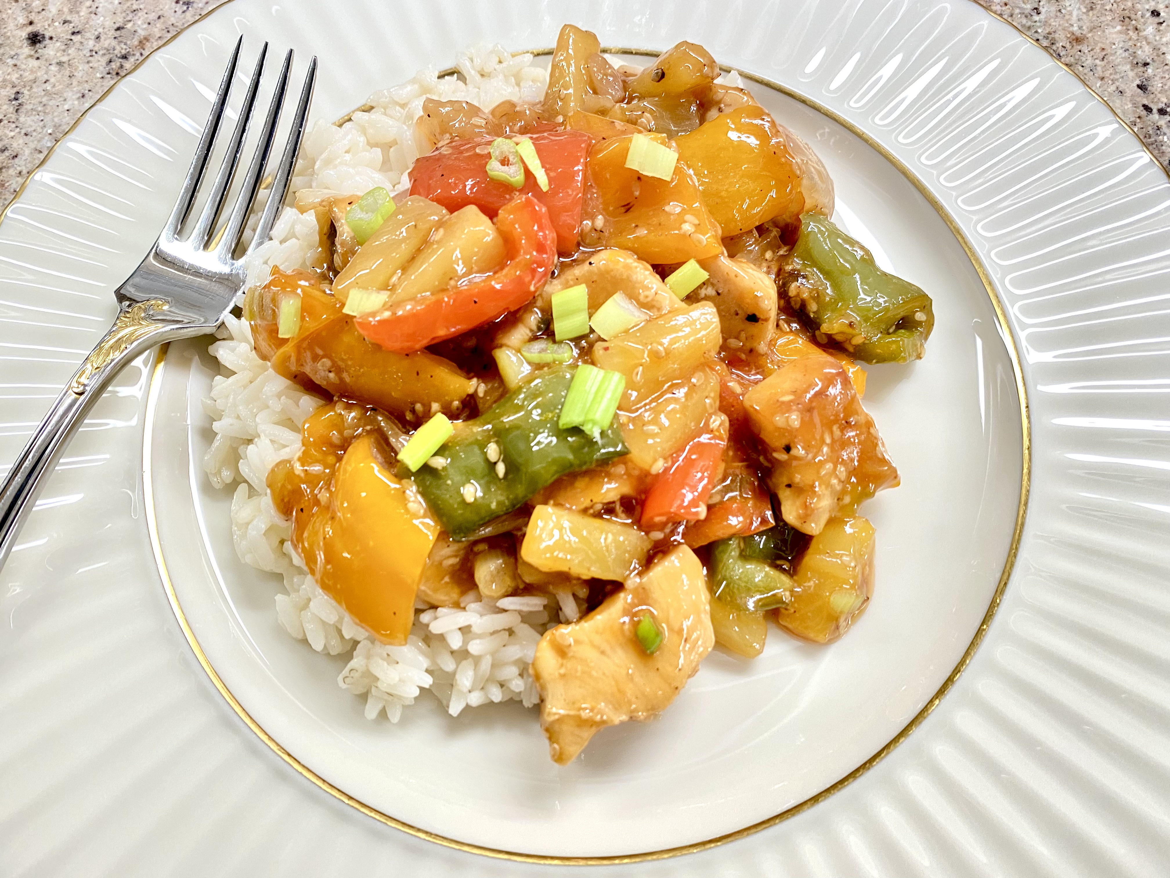 This is a one pan dish and has all the flavors of traditional sweet & sour chicken made in a wok! Serves 6 and it’s best served over white rice! The whole family will enjoy this delicious dish!