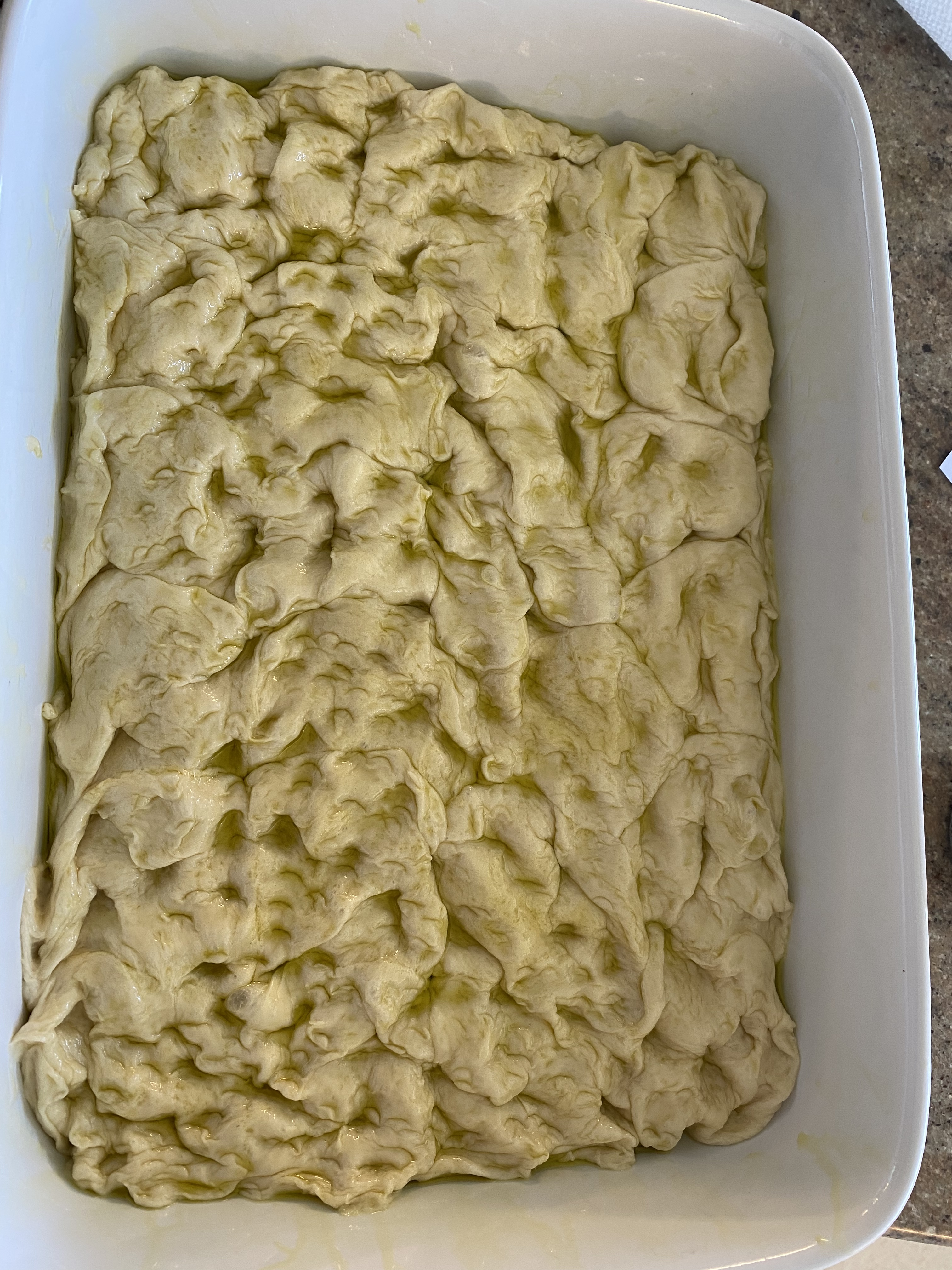 Drizzle with olive oil on top of the dough, creating indentations with your fingers.