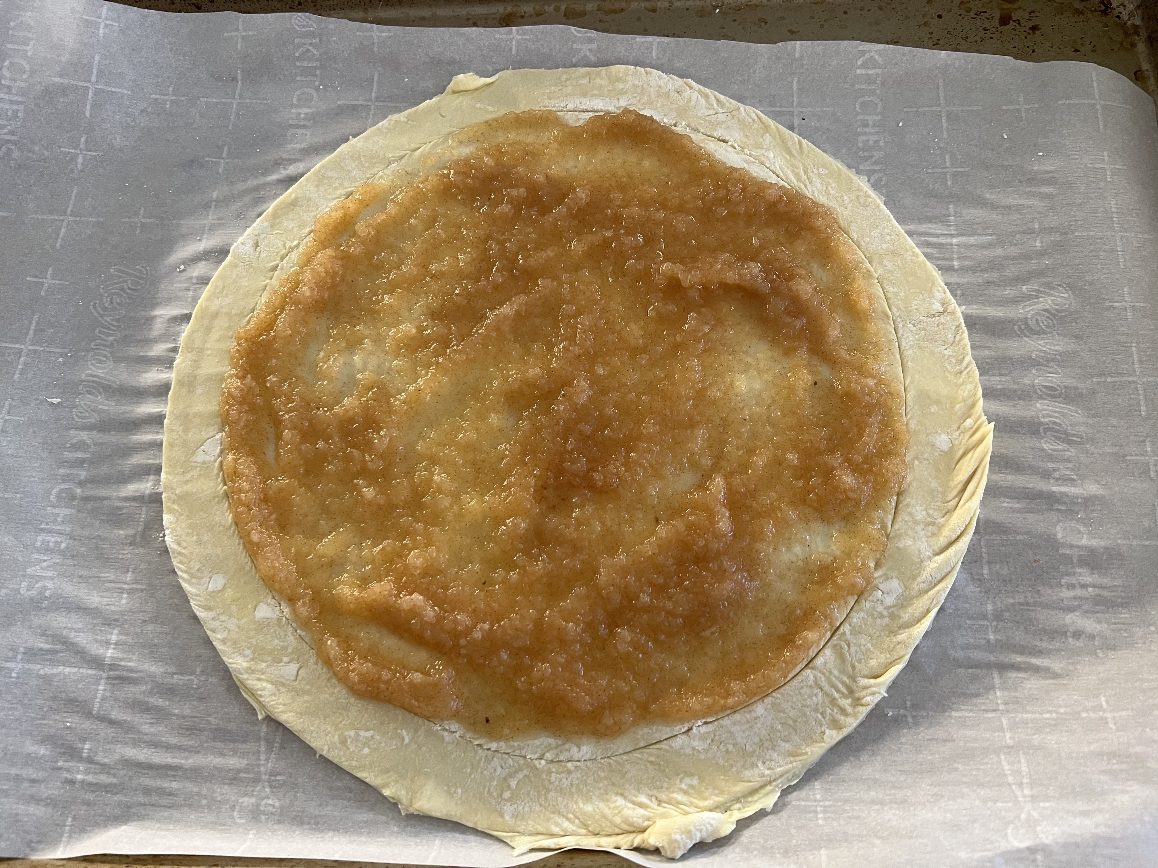 Score around the perimeter of the plate to create at least a 1 inch ”crust”. Mix the apple sauce and cinnamon. Spoon this mixture across the center circle creating a base for your tart. Do not go into the crust area.