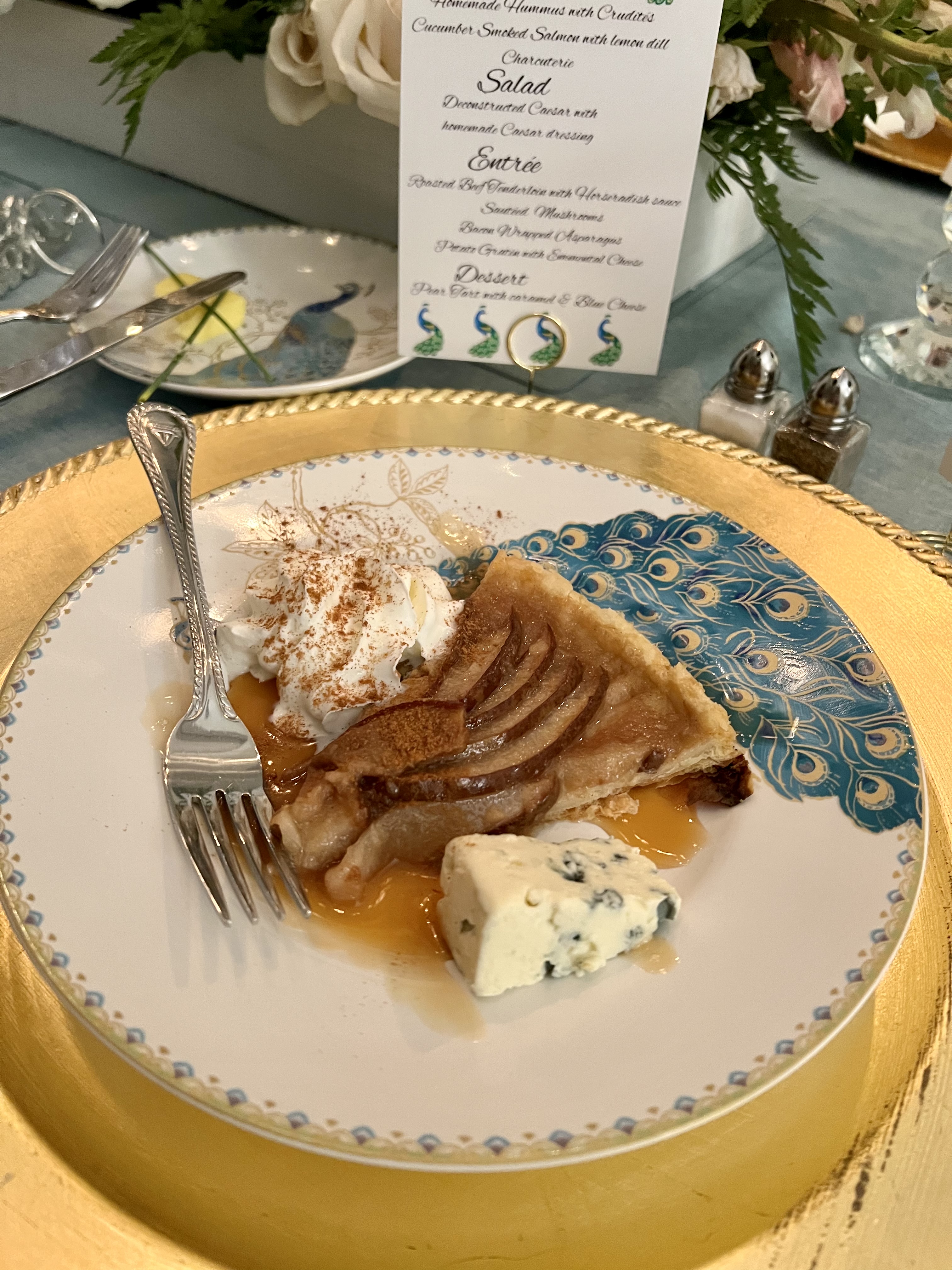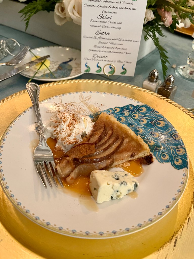 When serving, drizzle some caramel in a back and forth pattern on a dessert plate. Add a slice of the tart on top of the caramel and serve along with a side of whipped cream and a slice of good blue cheese. Serves 8.