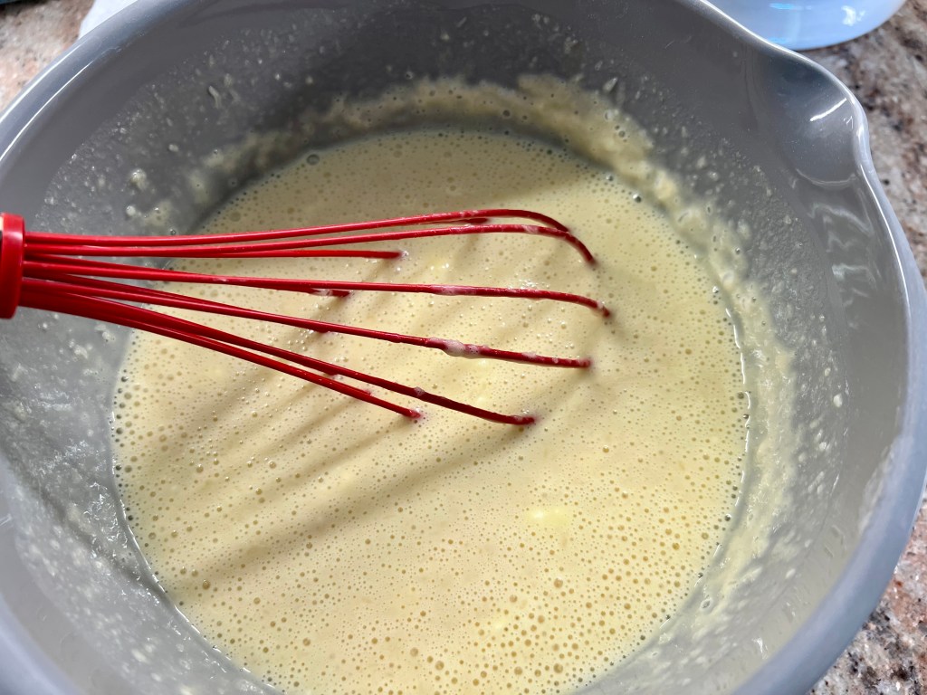 In a separate bowl, add flour, sugar, and baking powder, mix with a whisk. Add the dry ingredients slowly into the wet ingredients and mix well with a whisk.