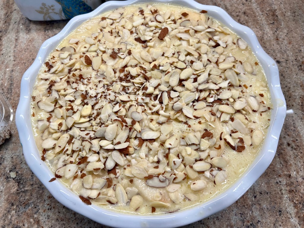 Pour combined mixture over pears. Arrange sliced almonds on top.