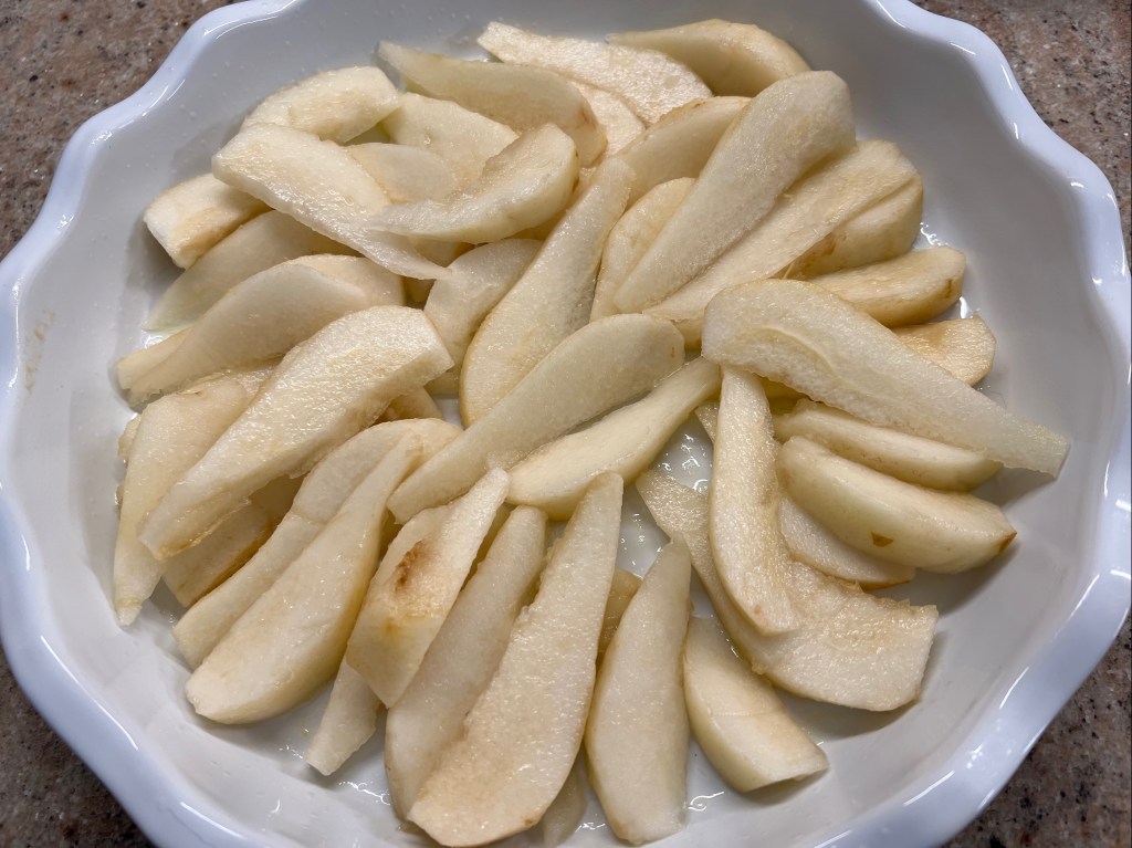 Arrange the sliced pears on the bottom of the pie pan in a circular pattern, filling in gaps. Set aside.