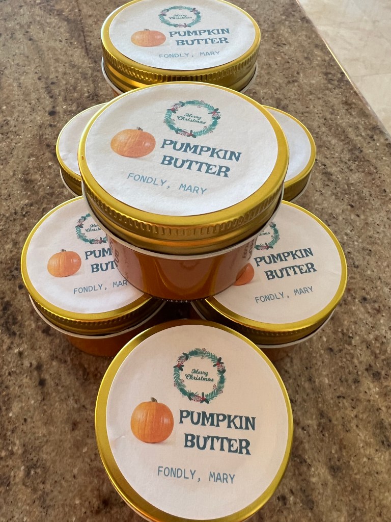 PUMPKIN, SPICE, AND EVERYTHING NICE…Pumpkin Butter is an easy recipe and I like making it in bulk. I buy 4 ounce mason jars from Amazon and fill each one with this delicious concoction and print and place a personalized label on top. It makes a great gift for friends, teachers and anyone you want to share with!