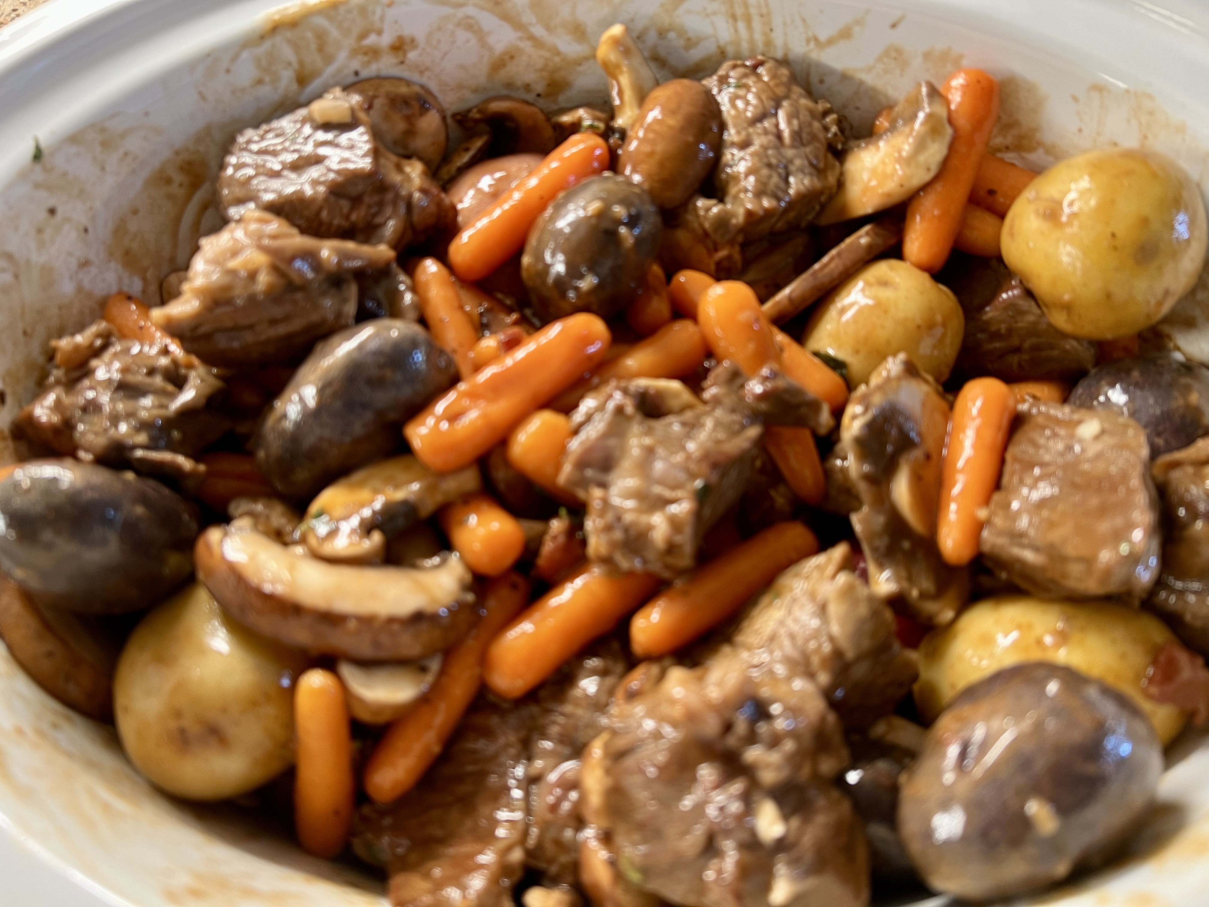 Add garlic, thyme, carrots, potatoes, and mushrooms to the slow cooker. Give it a good stir and cook on low until beef is tender, approximately 8 hours or high for 6 hours. Garnish with fresh parsley and serve over rice or mashed potatoes.