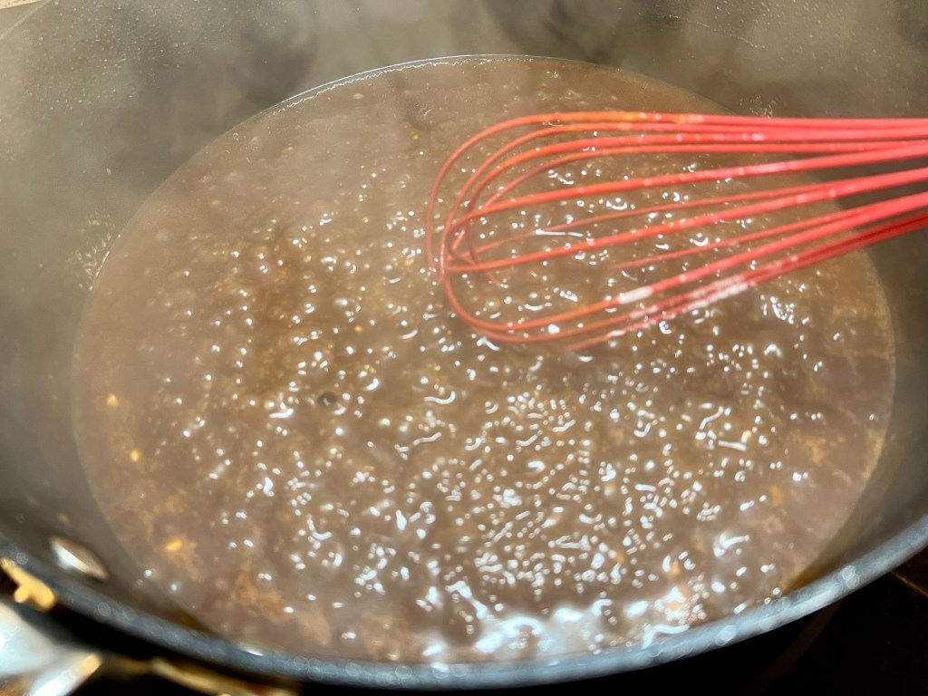 Add the red wine to the skillet and scrap down the brown bits on the side. Allow it to simmer and reduce and slowly add beef broth, tomato sauce, and soy sauce. Slowly whisk in the flour. Whisk until mostly smooth. Add the sauce to the slow cooker.