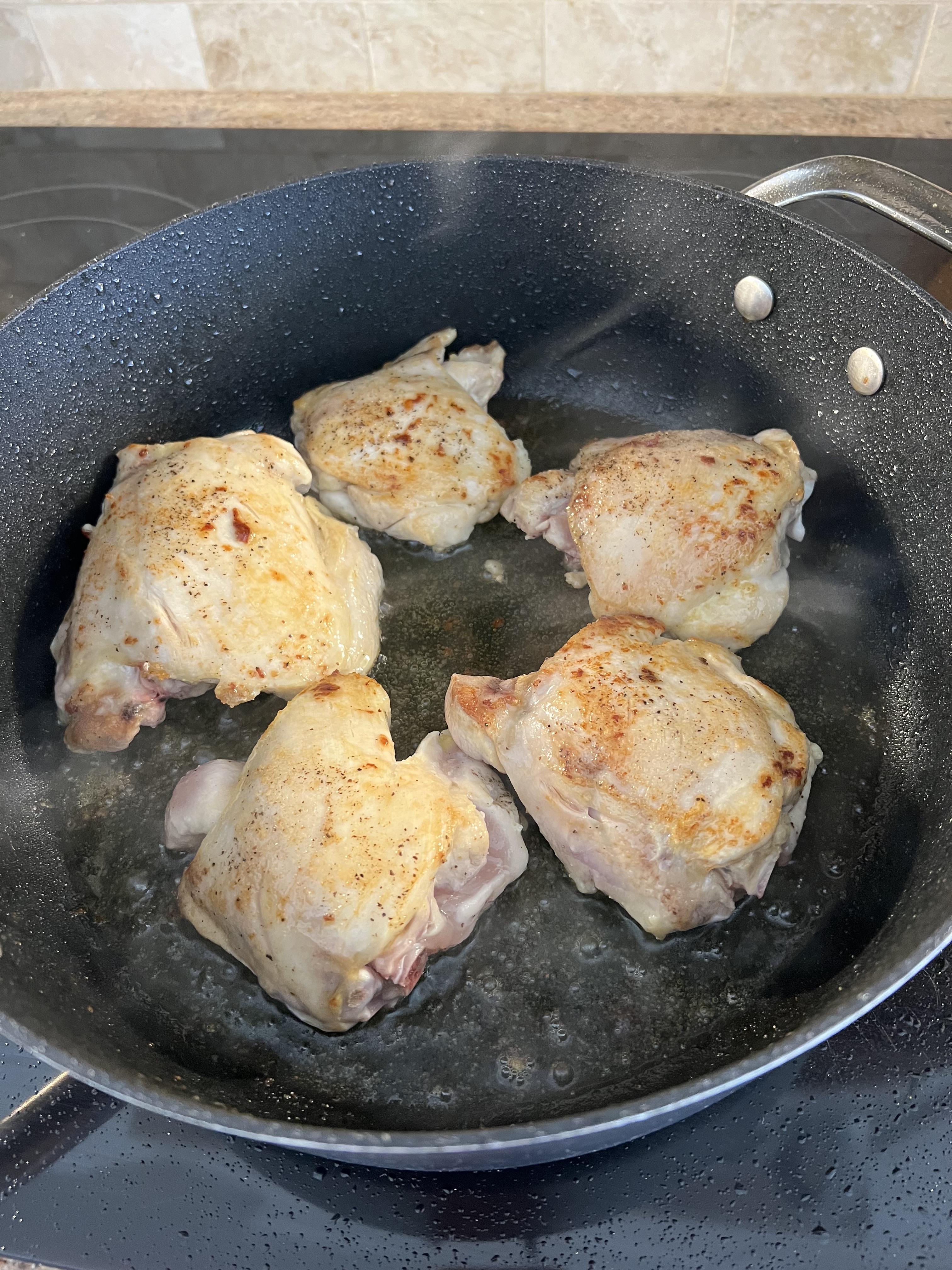 In a large, heavy skillet, heat the olive oil over medium heat. Season the chicken with salt and pepper on each side. When the oil is hot, cook the chicken until browned on both sides. Remove from the pan and set aside.