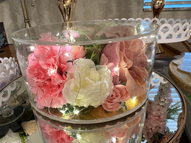 The middle of my stacked cake is an 8 inch plastic round box I bought from Amazon and filled with artificial flours and lights. I had a concept and made up a concept collage to see my vision first.