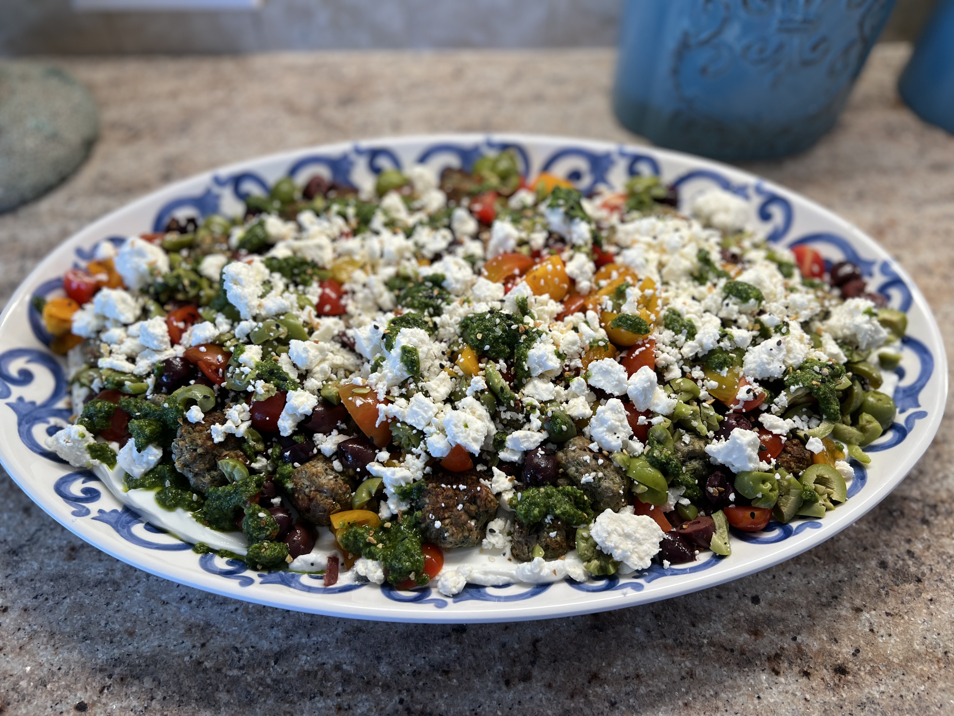 To serve, spoon the yogurt in the middle of a large plate or platter and use the back of the spoon to spread it. Add the Hummus in the middle and spread with back of the spoon. Drizzle some of the remaining herb sauce over the yogurt/humus. Arrange the meatballs on top, then garnish with the olives, tomatoes, feta and any remaining herb sauce. (Sprinkle with Everything Bagels seasoning or some salt & pepper). Serve with the warmed pita triangles.