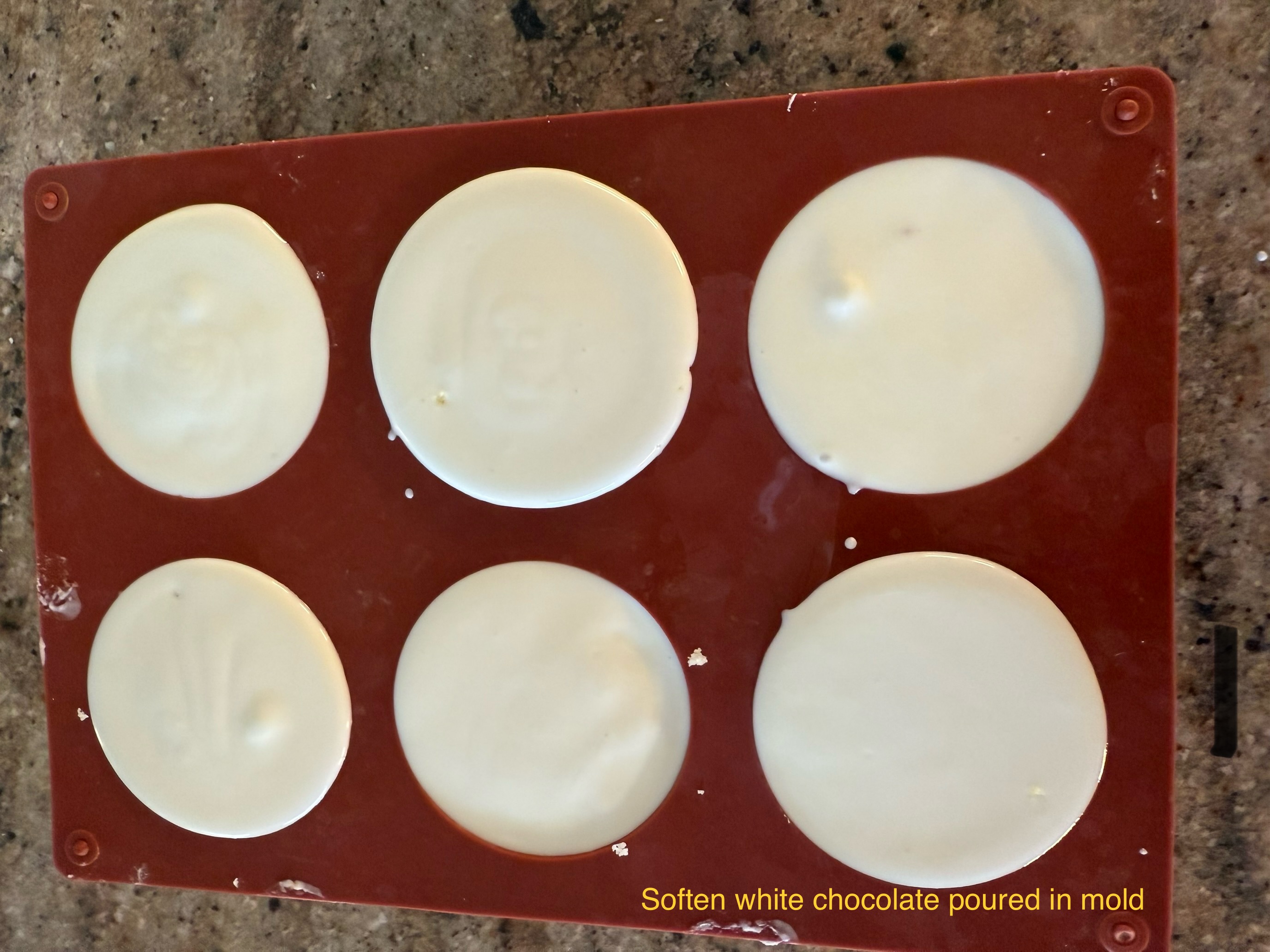 Place larger mold (with the Benty Cakes logo on the bottom) on the plastic tray and fill one cavity with 2 tablespoons with melted chocolate.