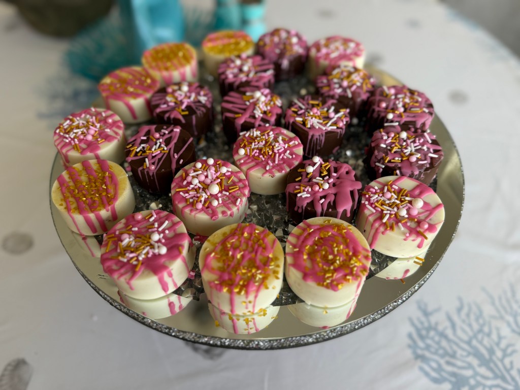 This is the latest fad and growing fast, it’s “Cake Pucks”. They are cakes and cookies, combined with a binding agents like buttercream icing and placed in a smaller mode to make disk. Then the are placed in a larger mode filled with melted chocolate (dark or white) and then topped again with melted chocolate to form a disk. There are so many variations and only your imagination can limit you! They are delicious!