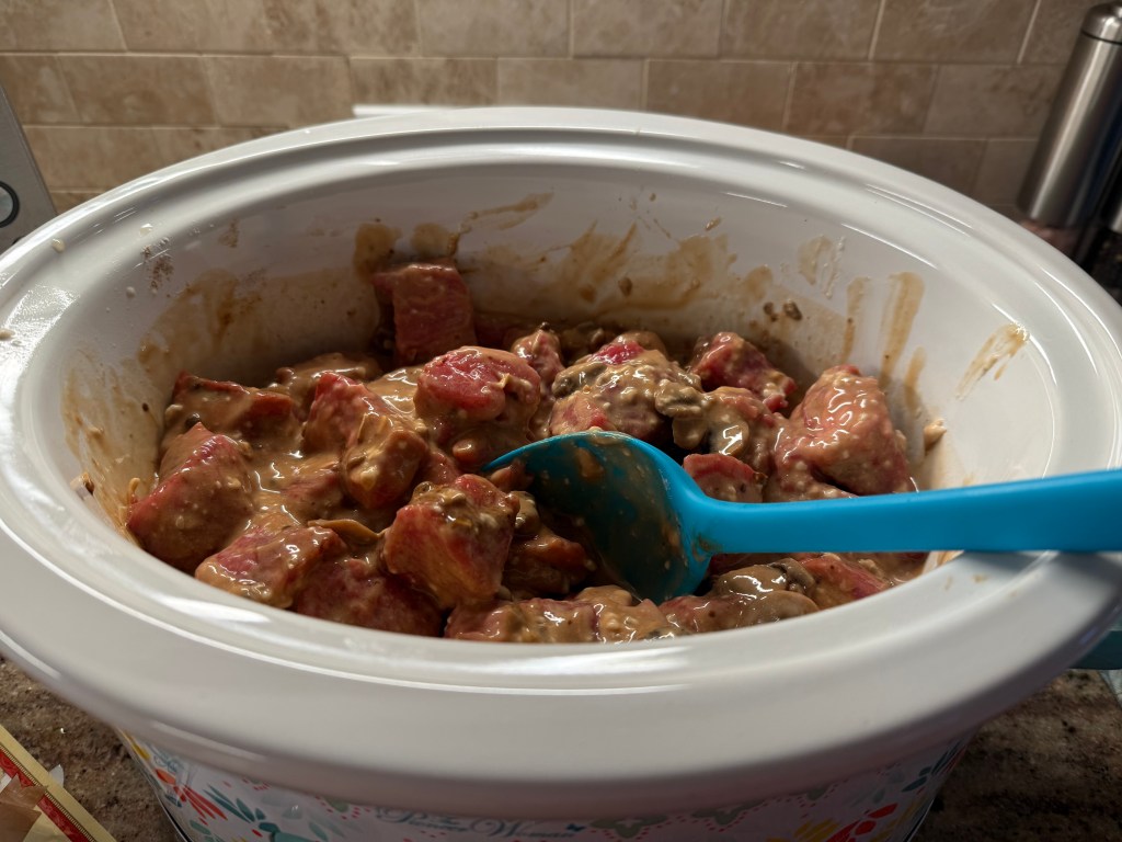 In your slow cooker, add the stew meat, Lipton onion soup mix, brown gray mix, cream of mushroom soup, and can of mushrooms. Add the broth—(Fill the empty can of cream of mushroom with the beef broth and pour into the crockpot. Stir everything together to ensure the ingredients are well combined. Cover and cook on low or 6-8 hours or high for 3-4 hours.